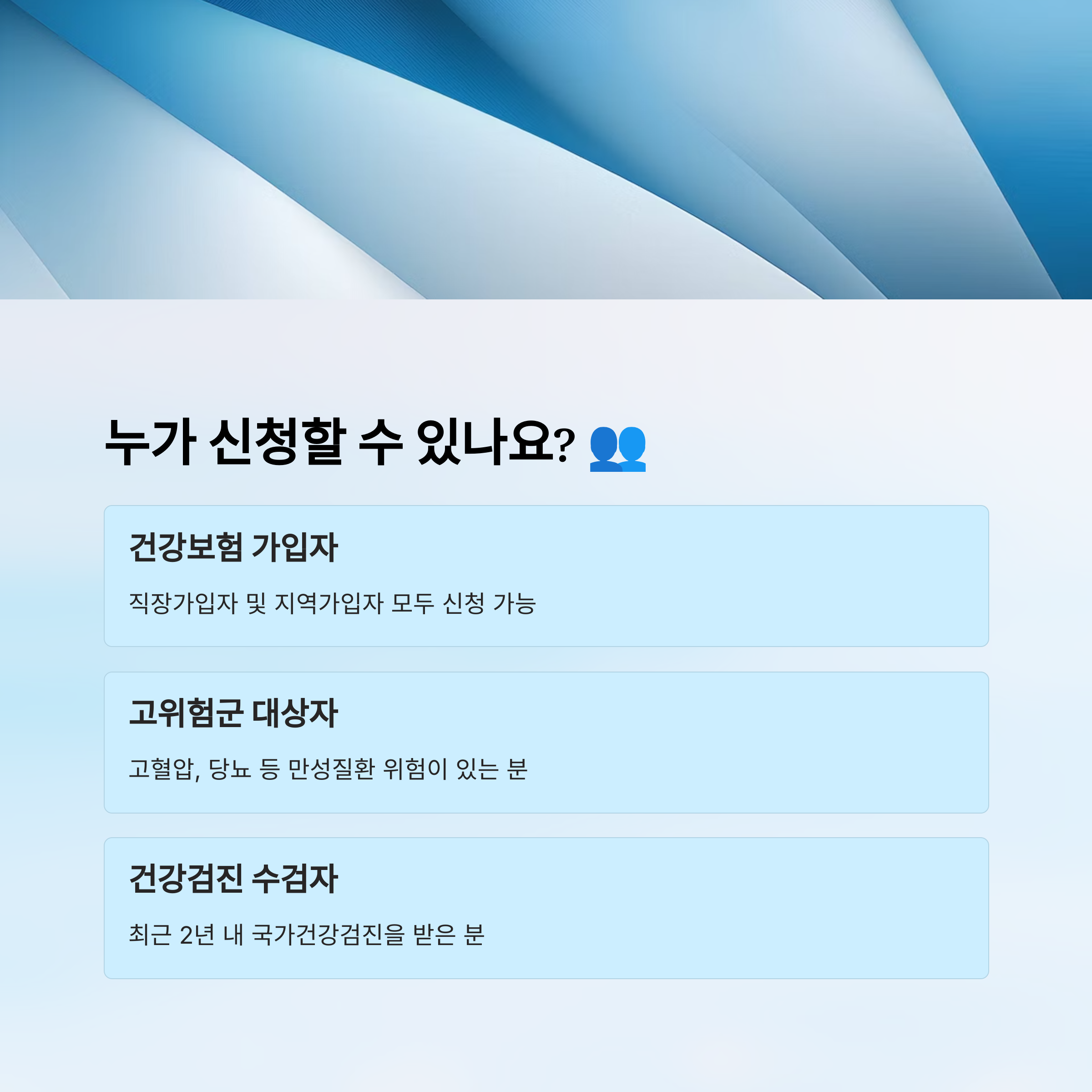 A1. 건강보험 가입자 중 일정 기준을 충족하는 분들만 신청할 수 있어요. 특히 건강검진을 받은 사람이나 만성질환 예방이 필요한 대상자가 우선 선정돼요.