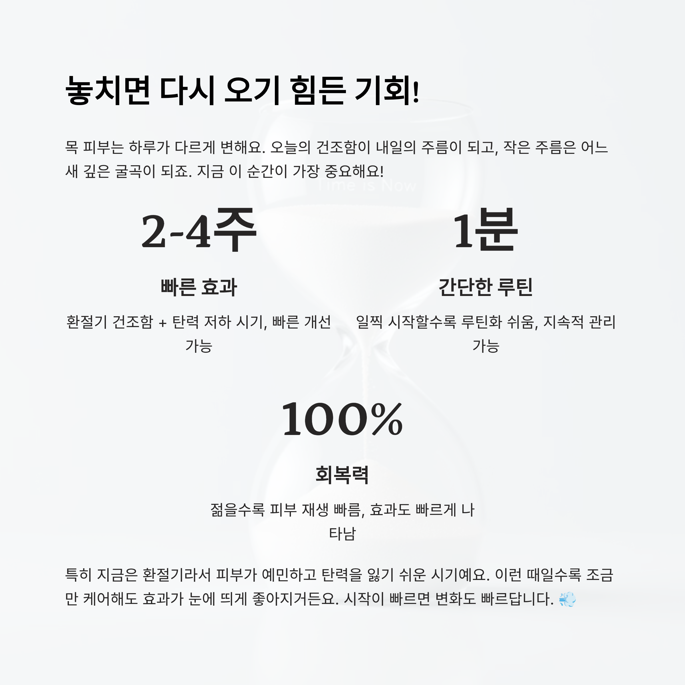 목 피부는 하루가 다르게 변해요. 오늘의 건조함이 내일의 주름이 되고, 작은 주름은 어느새 깊은 굴곡이 되죠. 그래서 지금 이 순간이 가장 중요해요! “언젠가 해야지”라는 생각은 늘 문제를 더 키우기만 해요. 지금 바로 시작하는 게 가장 빠른 방법이에요.