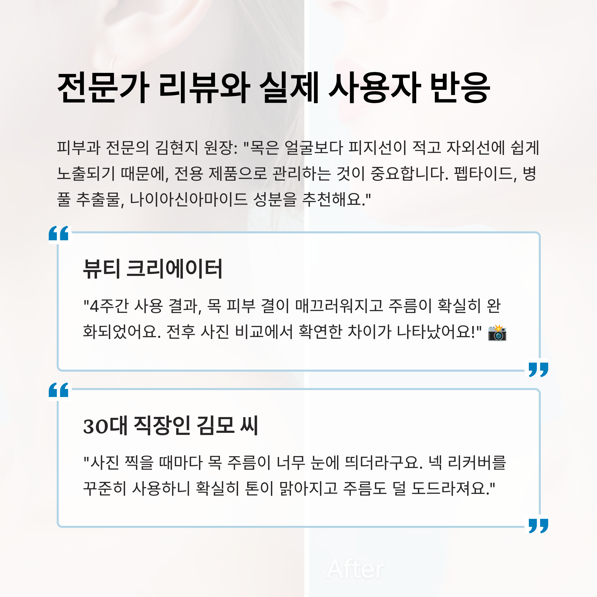 한 뷰티 크리에이터는 넥 리커버 크림을 4주간 사용한 결과, 목 피부 결이 매끄러워지고 주름이 확실히 완화되었다고 말했어요. 전후 사진 비교에서 확연한 차이가 나타났고, “넥 리커버 하나로 이 정도 변화를 줄 수 있다는 게 놀랍다”는 반응이었어요. 📸