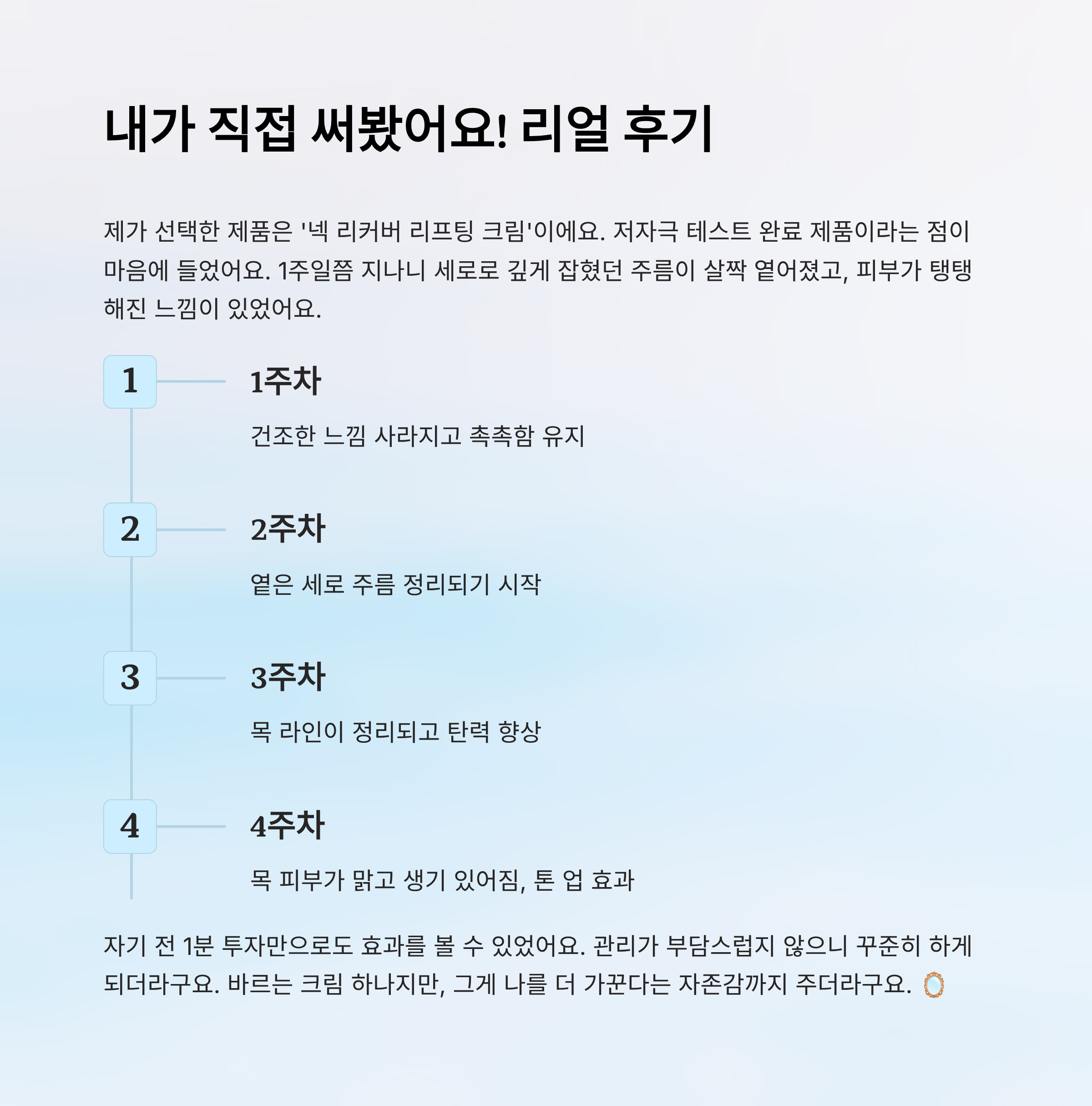 첫날엔 그냥 목에 바르는 느낌이었어요. 그런데 1주일쯤 지나니까 세로로 깊게 잡혔던 주름이 살짝 옅어진 걸 느꼈고, 특히 피부가 탱탱해진 느낌이 있었어요. 2주 차부터는 아침에 목이 칙칙하지 않고 맑은 느낌? 거울 볼 때 기분이 좋아졌어요. ✨