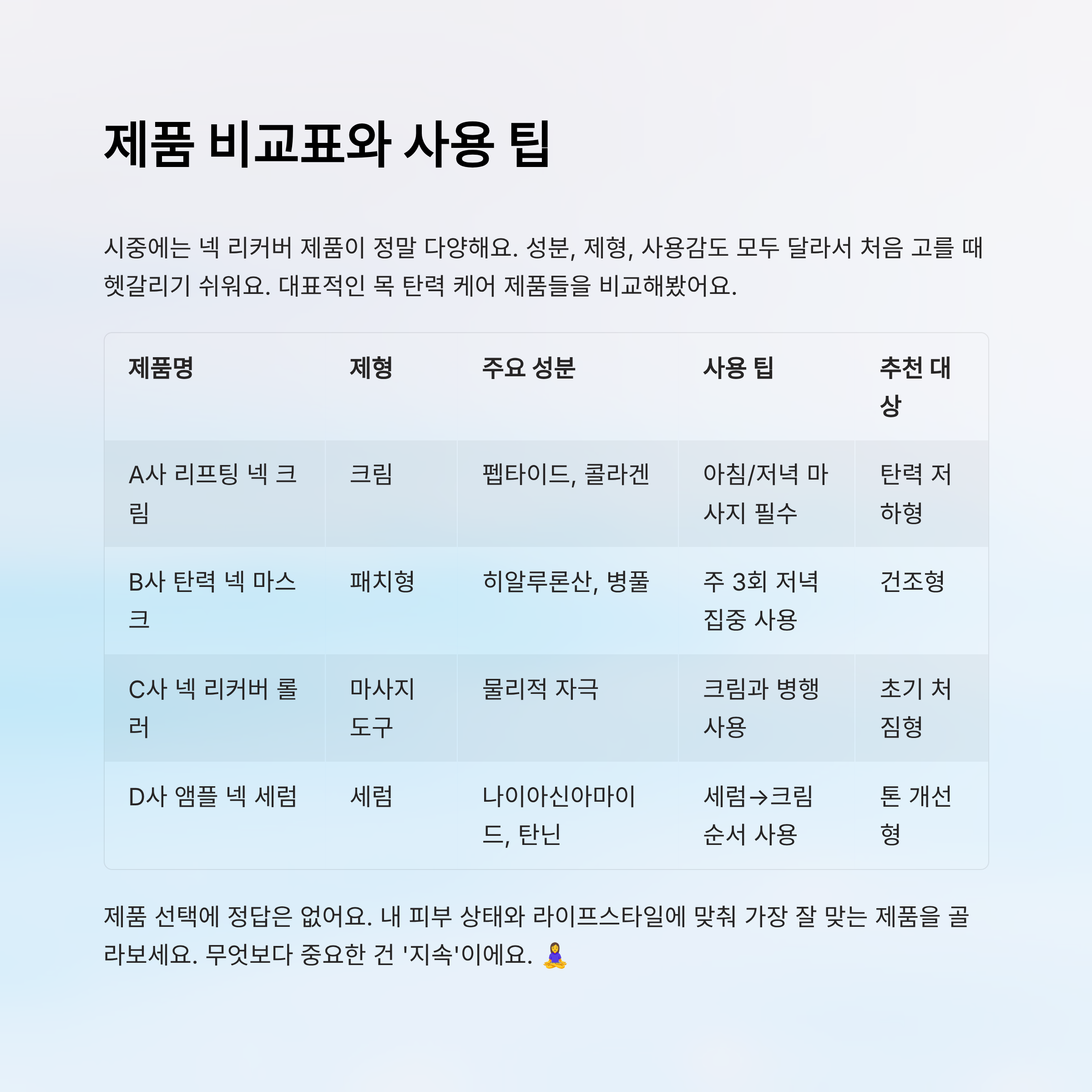 아래 표를 참고해서 나에게 딱 맞는 넥 리커버 루틴을 만들어보세요. 예쁜 목선, 건강한 탄력은 생각보다 가까이에 있어요!