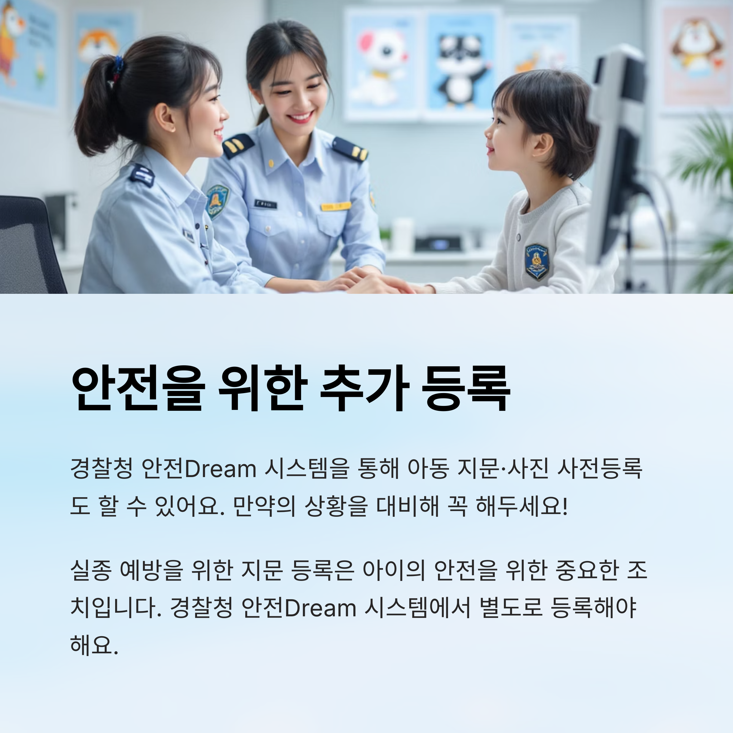 또한 경찰청 안전Dream 시스템을 통해 아동 지문·사진 사전등록도 할 수 있어요. 만약을 대비해 꼭 해두는 게 좋아요! 💡