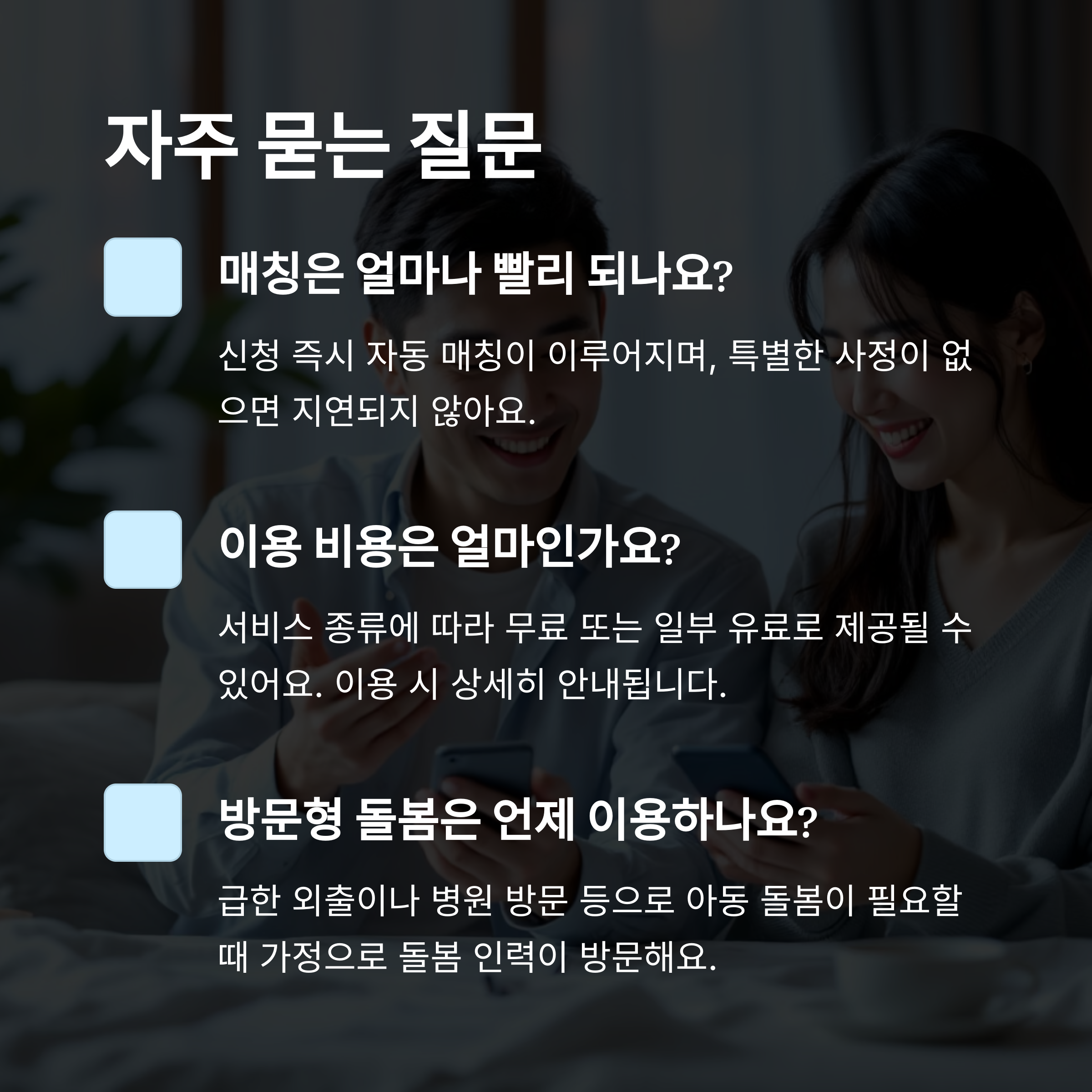A2. 신청자의 거주지, 아동 정보, 필요 시간에 따라 자동으로 적합한 기관이나 인력과 매칭돼요.