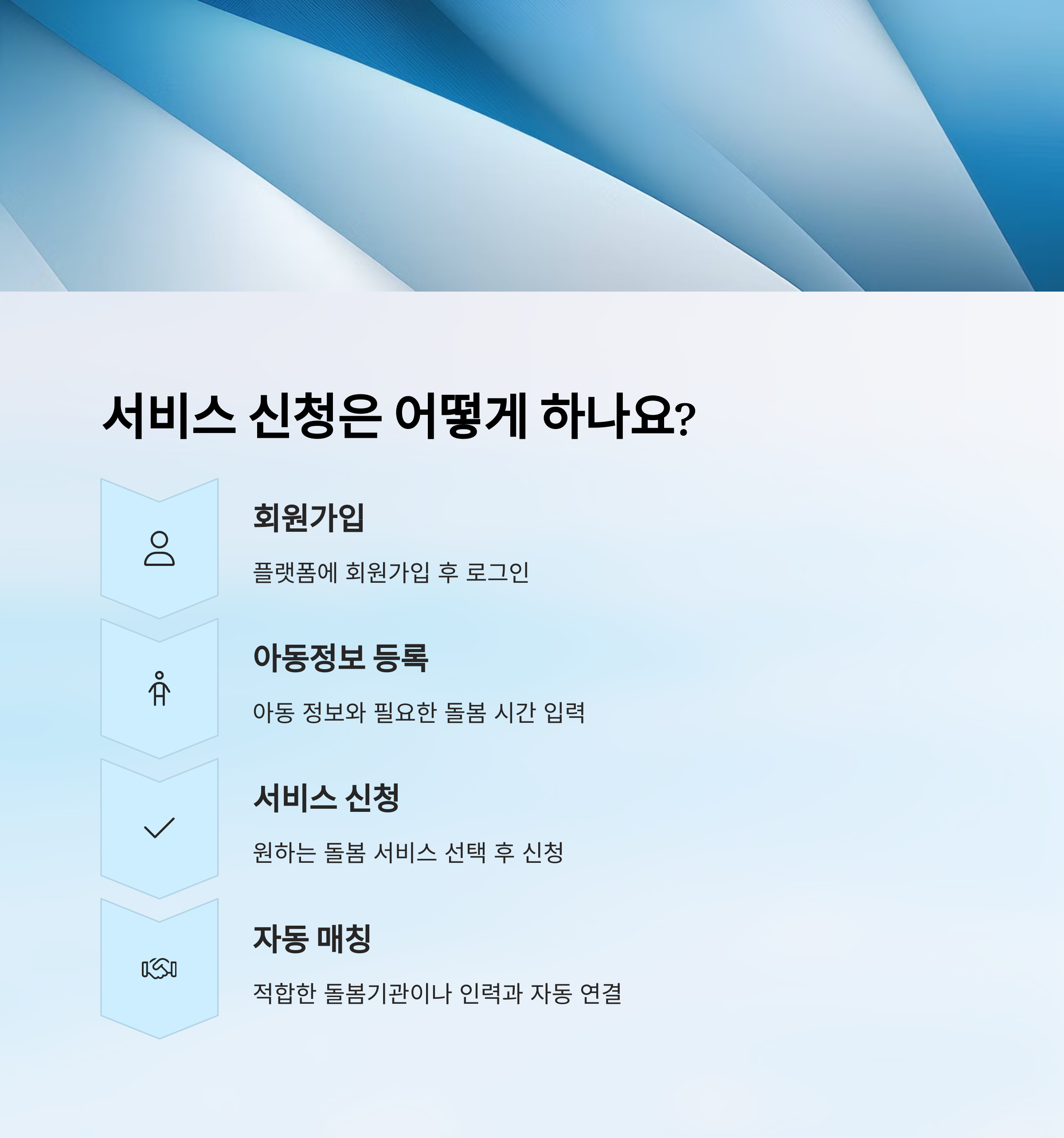 플랫폼을 통해 돌봄서비스를 신청하면, 바로 원스톱 매칭 시스템이 작동해요! 🔥 신청자의 거주지, 아동 정보, 필요한 시간대 등을 바탕으로 가장 적합한 돌봄기관이나 돌봄 인력과 자동으로 연결돼요.