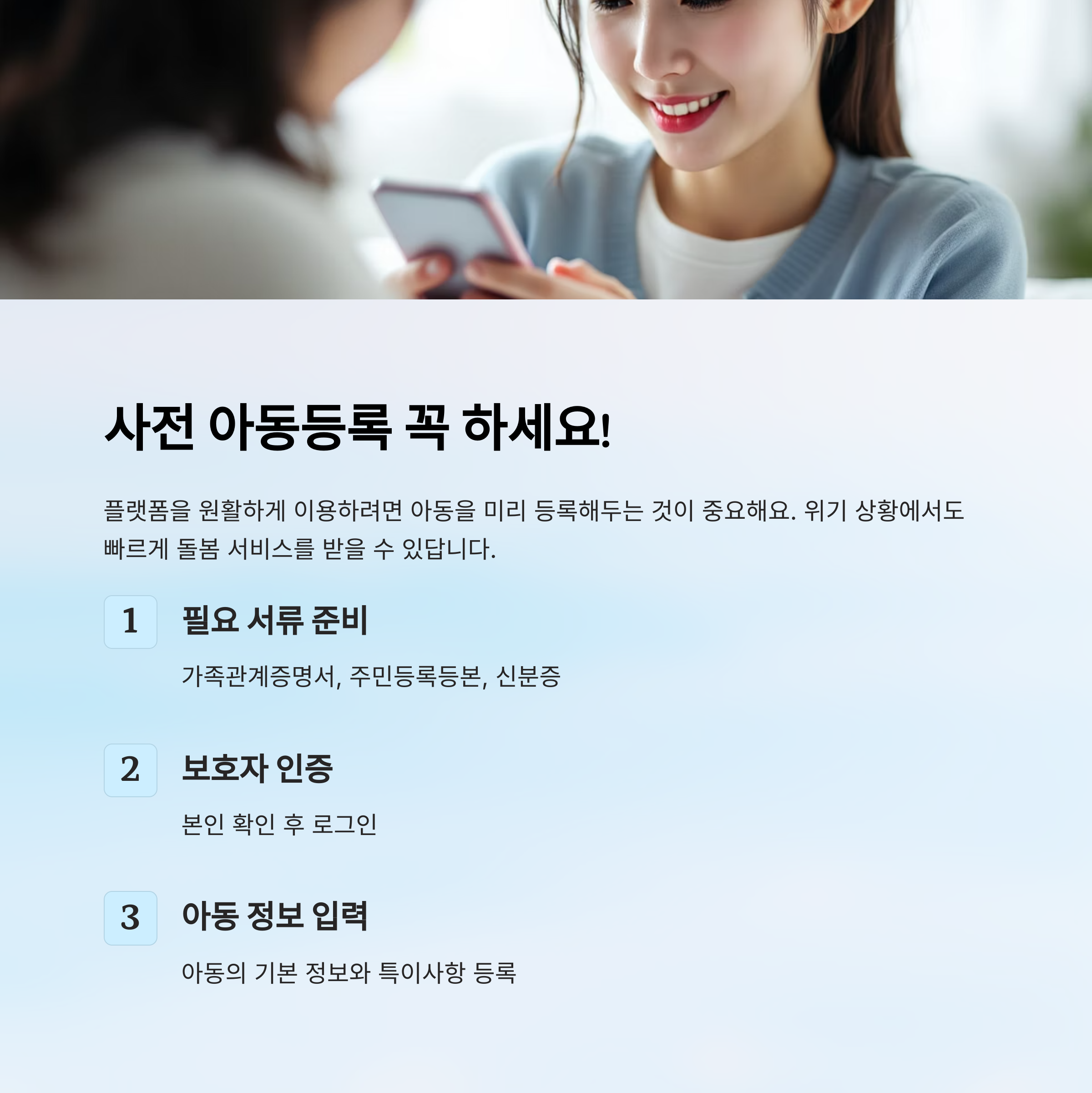 등록 절차는 아주 간단해요. 보호자 인증 후 아동 정보를 입력하면 끝! 위기 상황에서도 빠르게 돌봄 서비스를 받을 수 있도록 미리 등록해두는 걸 추천해요.