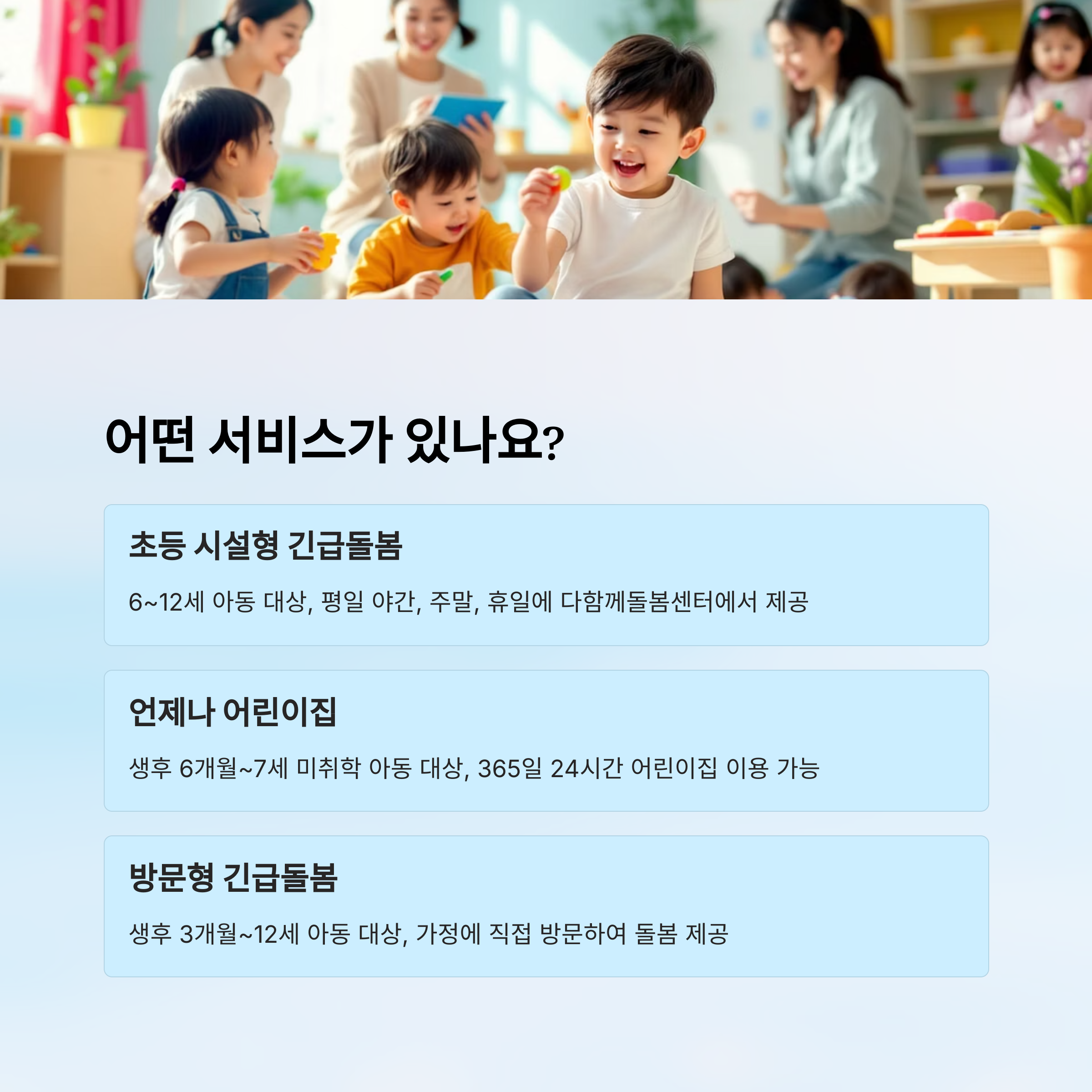 | 초등 시설형 긴급돌봄 | 6~12세 | 평일 야간, 주말, 휴일 | 다함께돌봄센터 연계 |