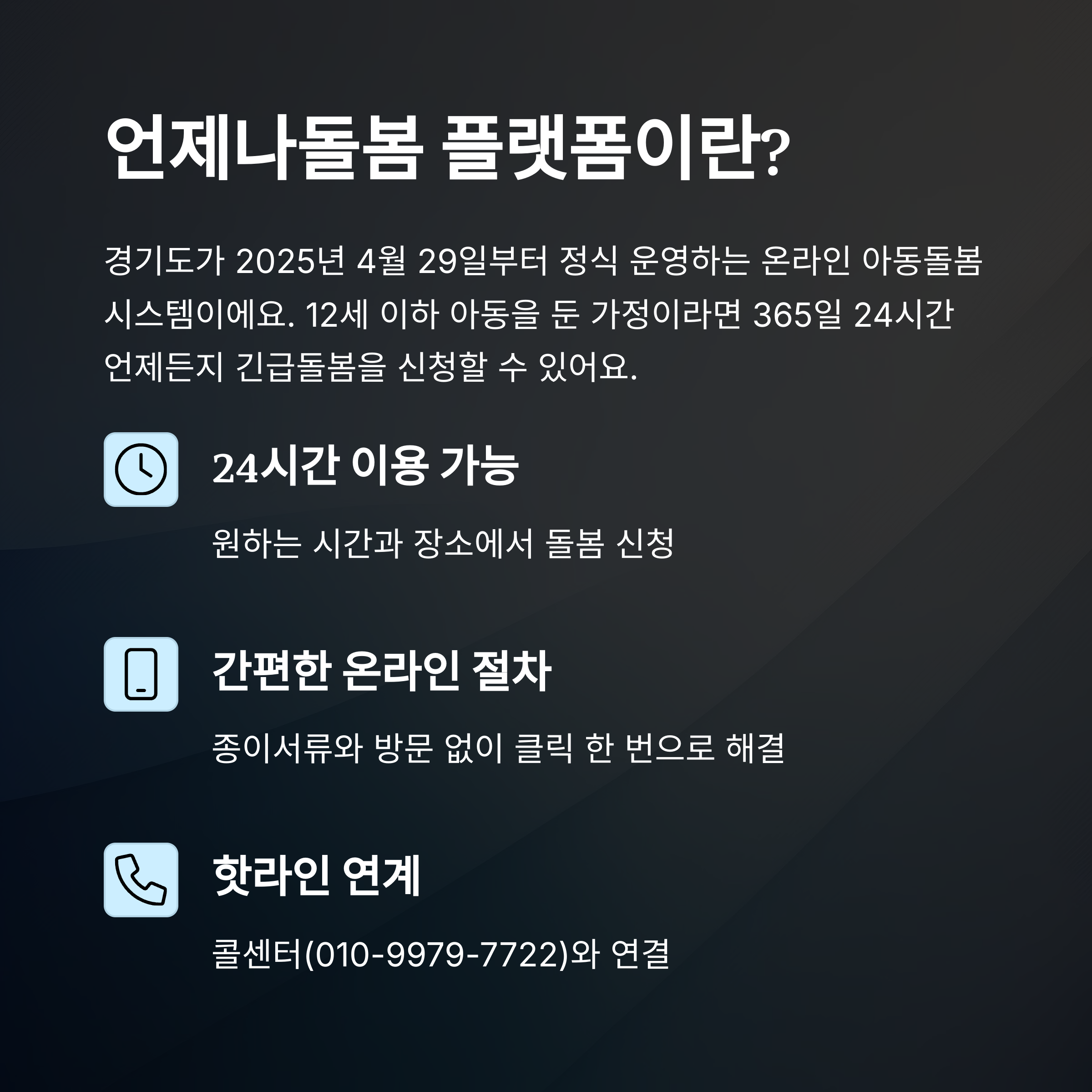 경기도가 2025년 4월 29일부터 아동 언제나돌봄 플랫폼(www.gg.go.kr/always360)을 정식 운영하게 됐어요! 🎉 기존에 시범운영을 거치면서 많은 피드백을 반영해 더욱 완성도 높은 서비스를 준비했답니다. 12세 이하 아동을 둔 가정이라면 365일 24시간 언제든지 긴급돌봄 신청이 가능한 정말 편리한 시스템이에요.