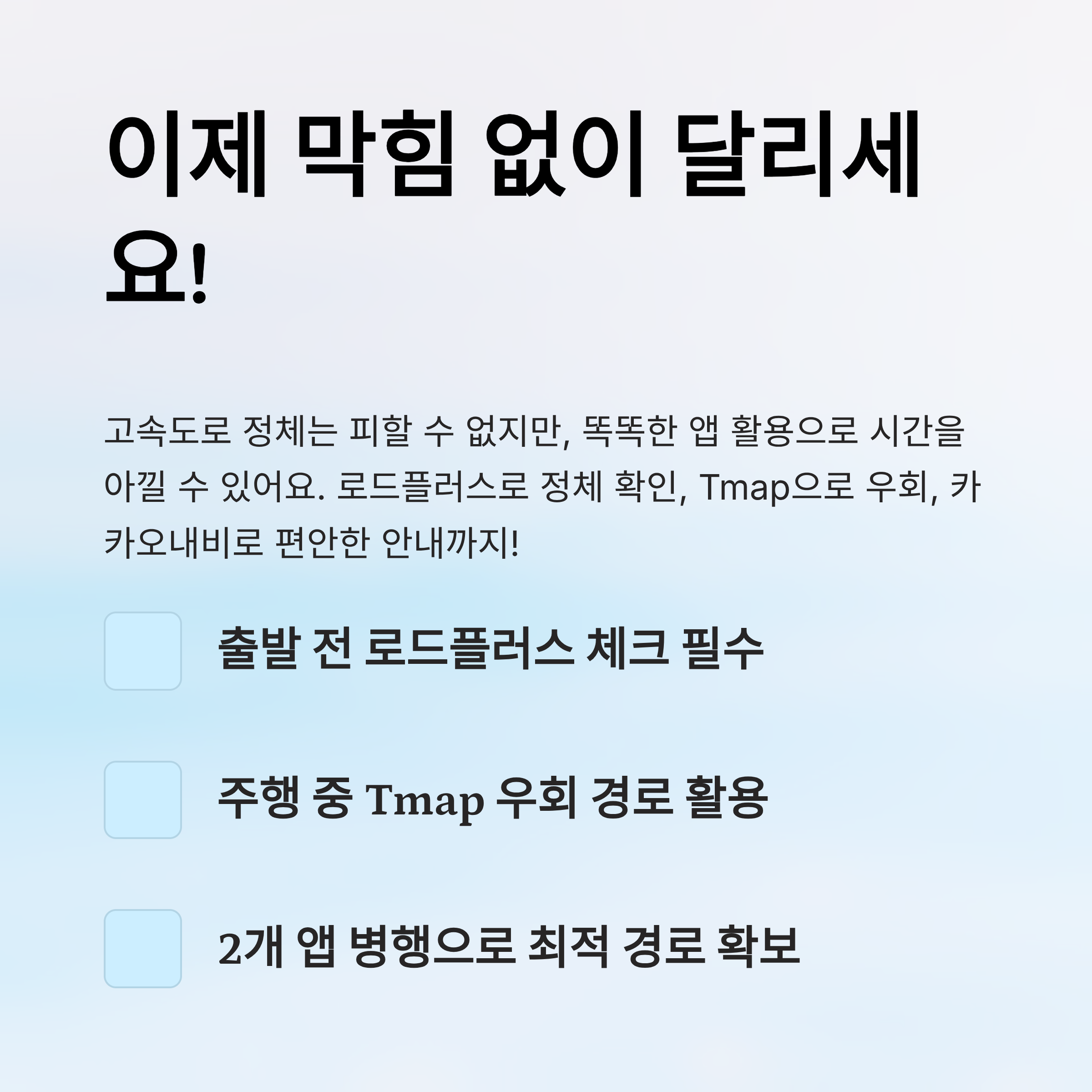 정리하자면, 경부고속도로에서 빠르게 정체 구간을 피하려면 로드플러스를 참고해 정체 상황을 먼저 확인한 뒤, Tmap을 통해 우회경로를 적극 활용하는 방식이 효과적이에요. 실시간 판단과 빠른 선택이 이번 명절의 키 포인트랍니다! 🚘