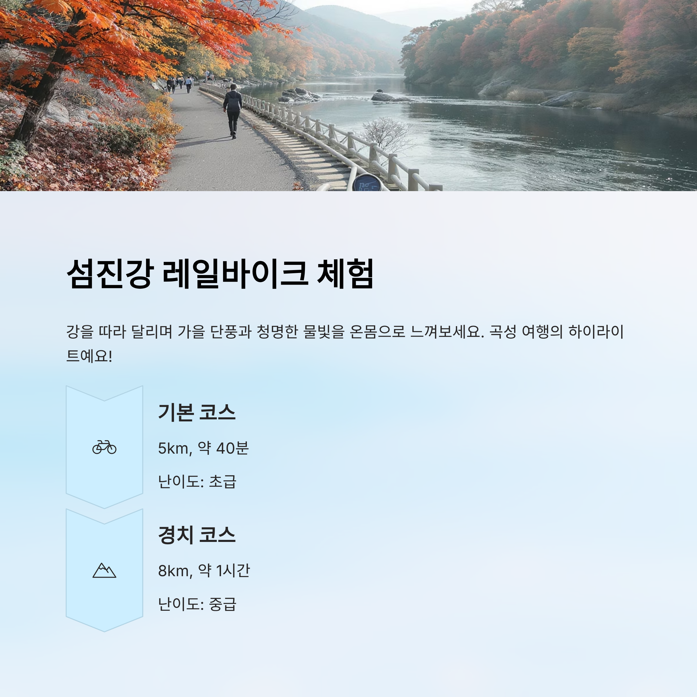 코스 선택은 체력과 일정에 맞게 결정하면 좋아요. 기본 코스는 가볍게 즐기기 좋고, 경치 코스는 단풍과 강의 풍경을 더 오래 감상할 수 있어요.