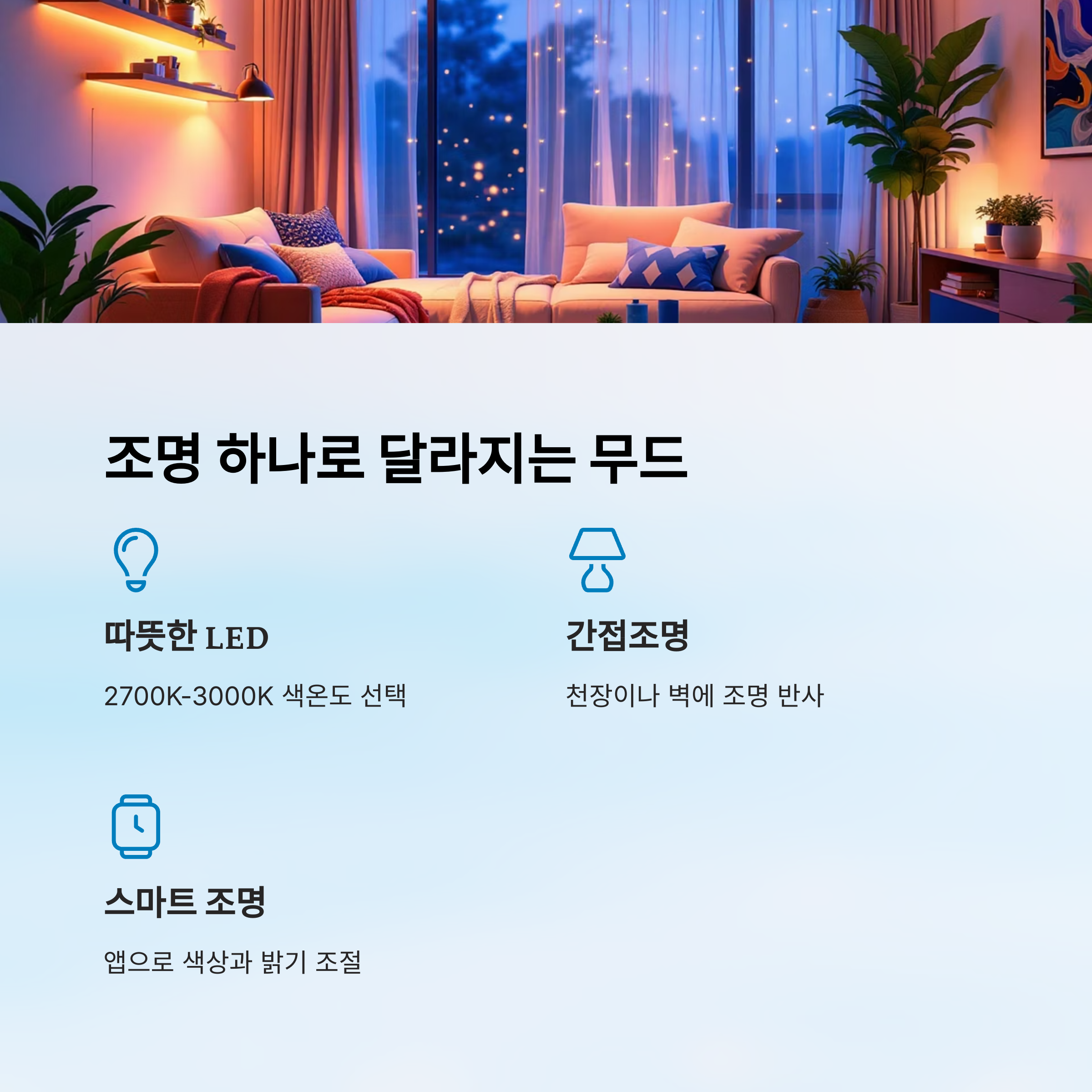 필립스 휴 같은 스마트 전구를 사용하면 색온도나 밝기를 자유롭게 바꿀 수 있어서 봄에서 여름, 가을까지 계절에 따라 활용 가능해요. 📱