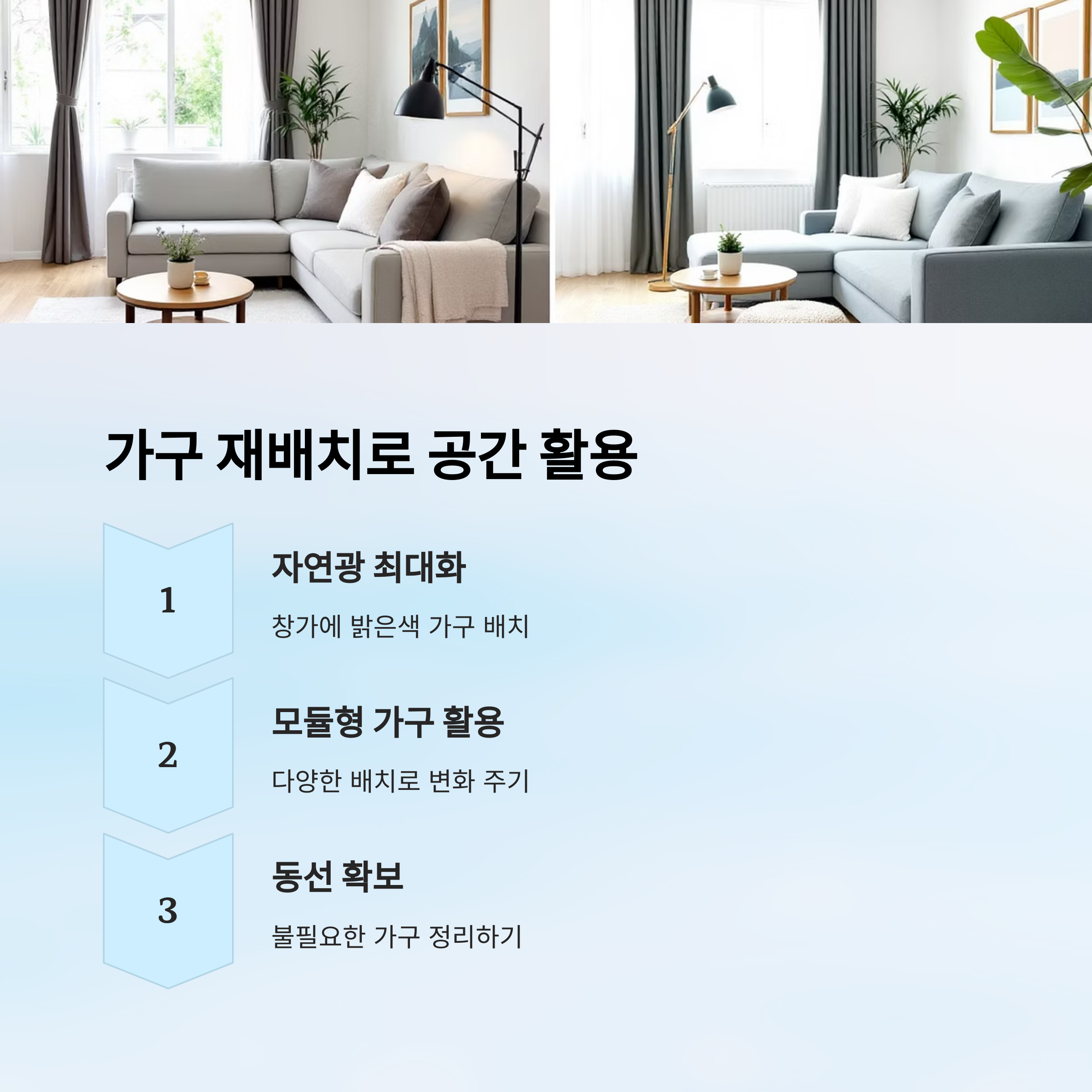 | 거실 | 소파를 창가로 이동 | 채광 향상 + 분위기 전환 |