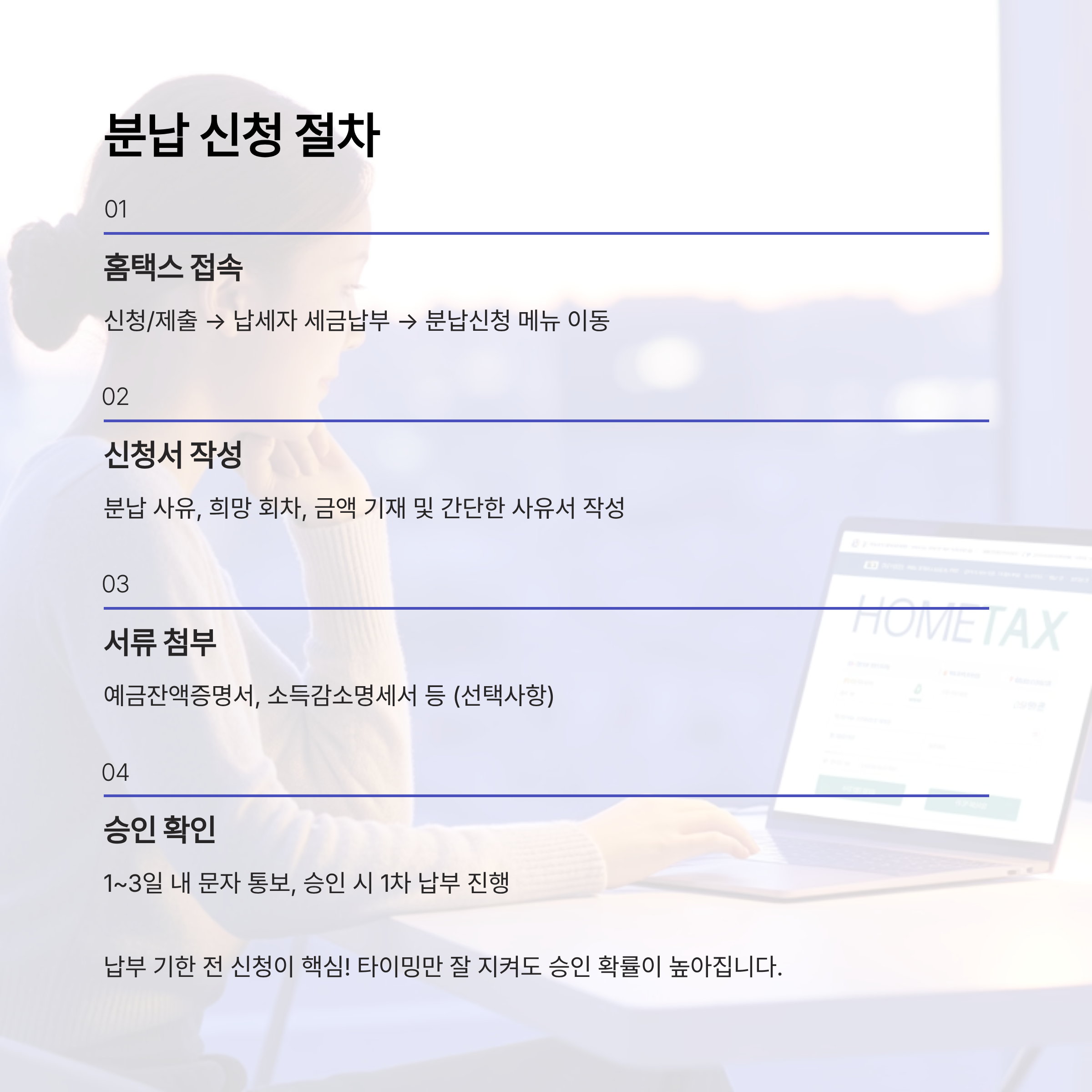 홈택스를 통한 신청 시에는 [신청/제출] → [납세자 세금납부] → [분납신청] 메뉴로 이동하면 돼요. 신청서에는 분납 사유, 분납 희망 회차, 금액 등을 기재해야 하고, 간단한 사유서 작성만으로도 접수는 가능해요.