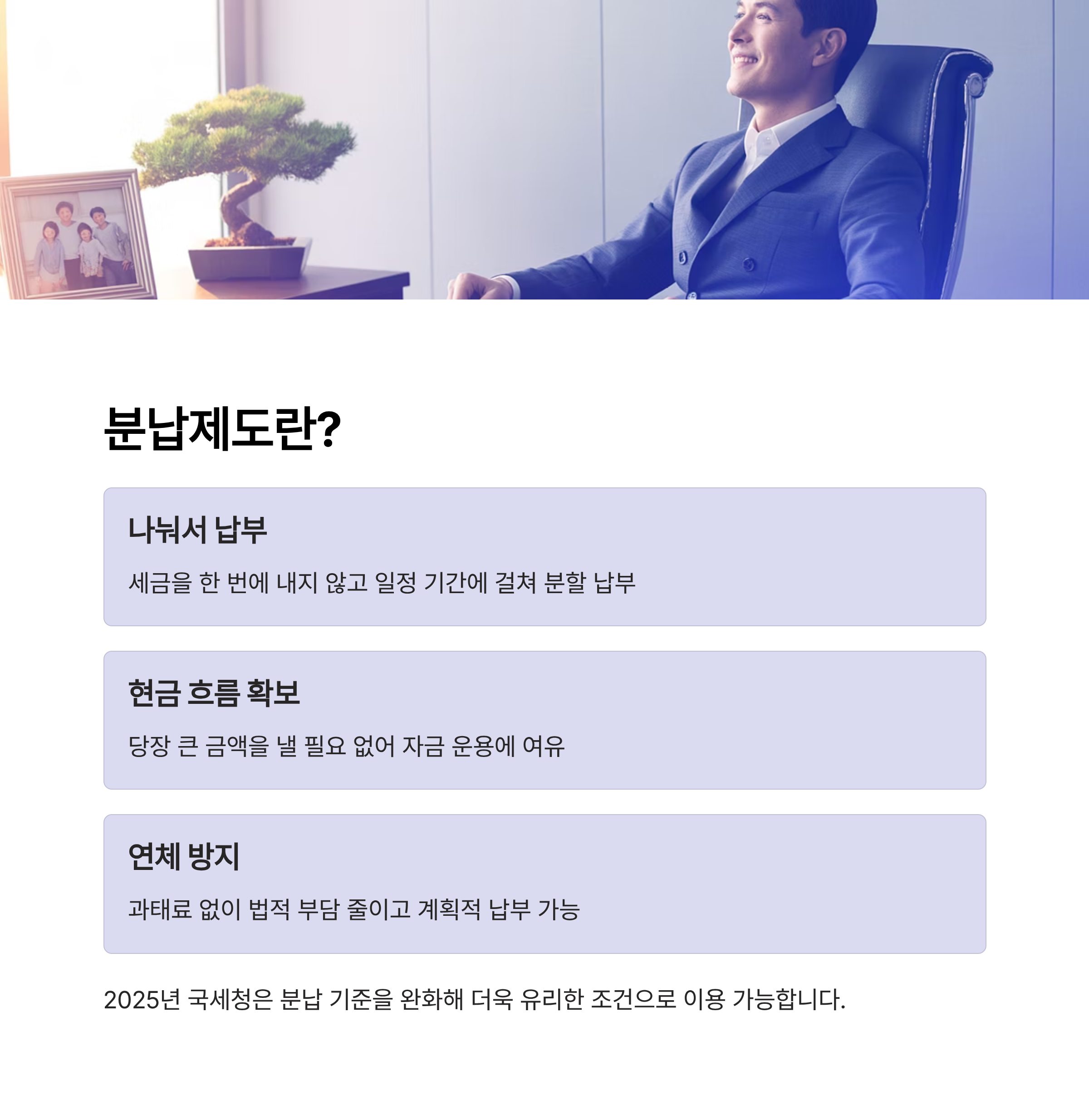 이럴 때 활용하면 좋은 제도가 바로 ‘분납제도’예요. 세금을 한 번에 납부하는 대신 나눠서 낼 수 있어, 연체 없이 법적인 부담도 줄이고 현금 유동성도 확보할 수 있답니다. 특히 2025년에는 국세청이 분납 인정을 더 유연하게 해주는 분위기라서, 활용하면 정말 유리해요.