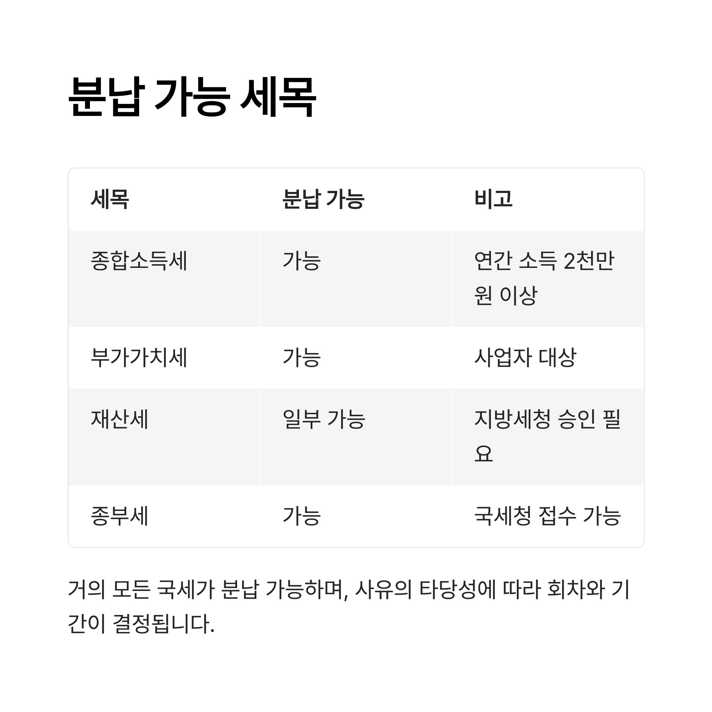 분납이 가능한 세목이 제한적이라고 생각할 수 있지만, 실제로는 거의 대부분의 국세가 가능해요. 다만 분납 사유의 타당성과 금액의 규모에 따라 회차 수나 기간은 달라진답니다.