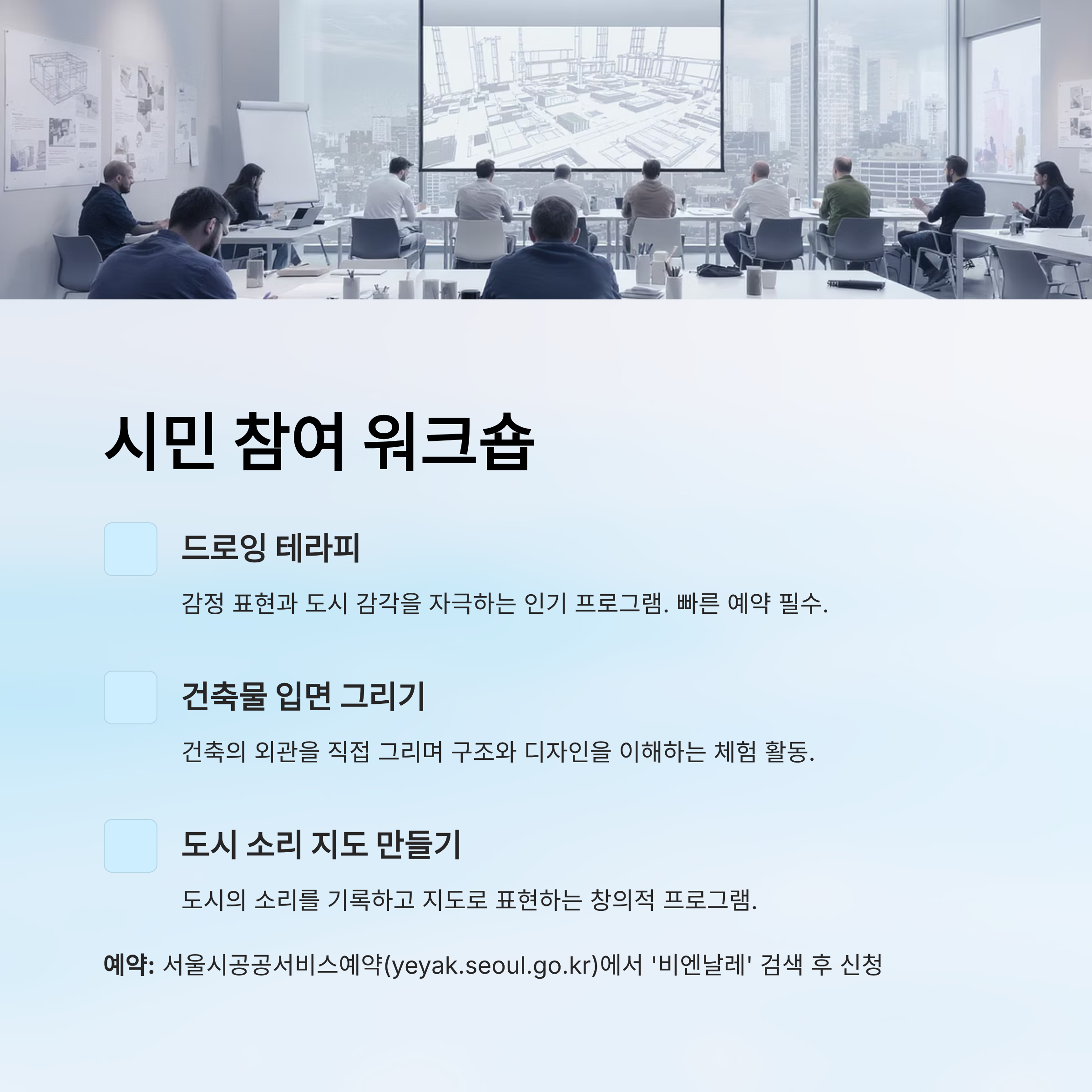 서울도시건축비엔날레에서는 시민이 주인공이에요! 🧍♀️🧍♂️ 다양한 시민 참여형 워크숍이 준비되어 있고, 대부분 온라인 사전 예약이 필수예요. 예약하지 않으면 현장에서 참여가 어려운 경우가 많으니 미리미리 챙기는 게 좋아요.