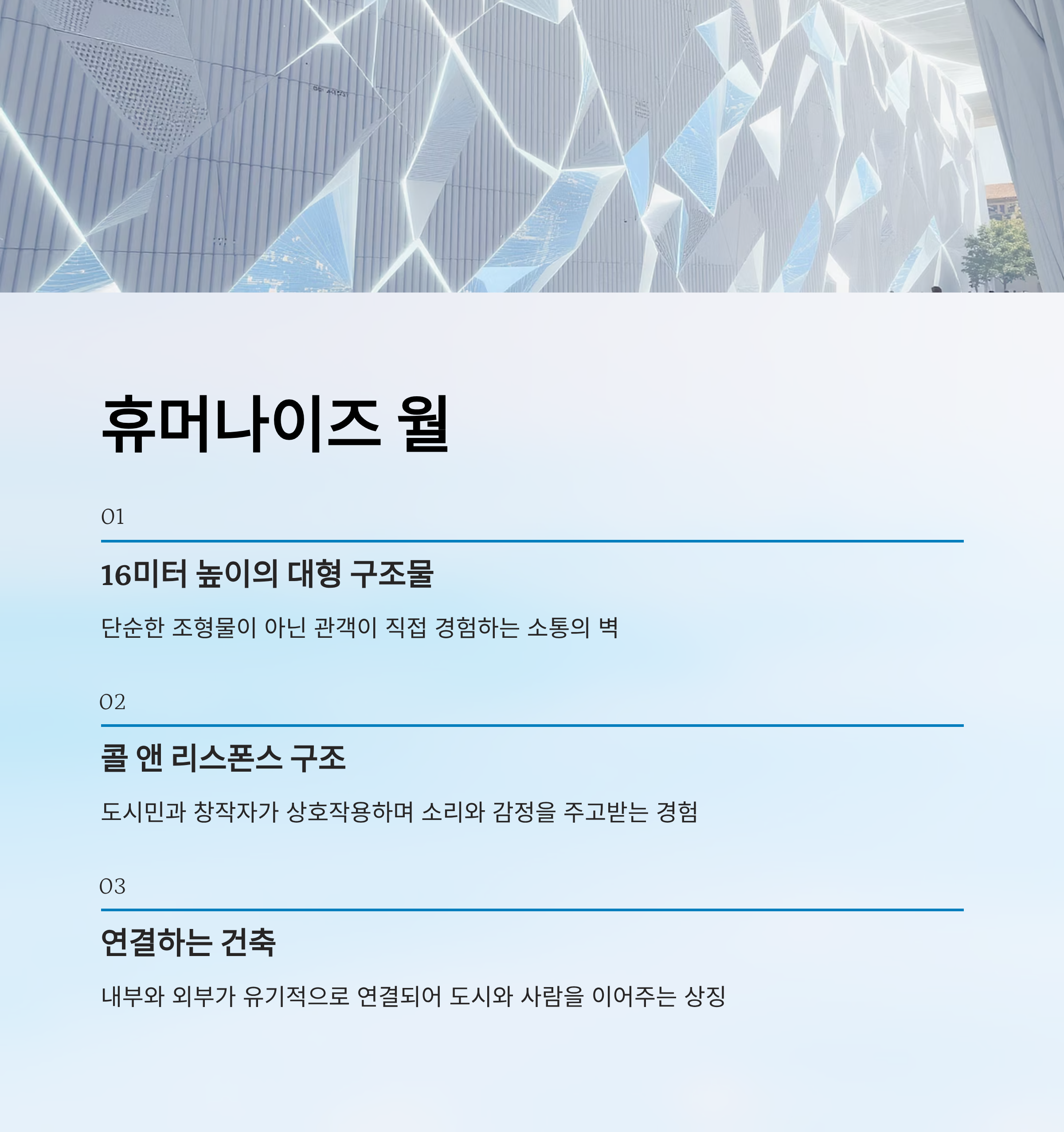 | 벽 구조 | 높이 16m의 조형물 | 도시의 소통과 연결 | 직접 걷고 만지는 체험 |