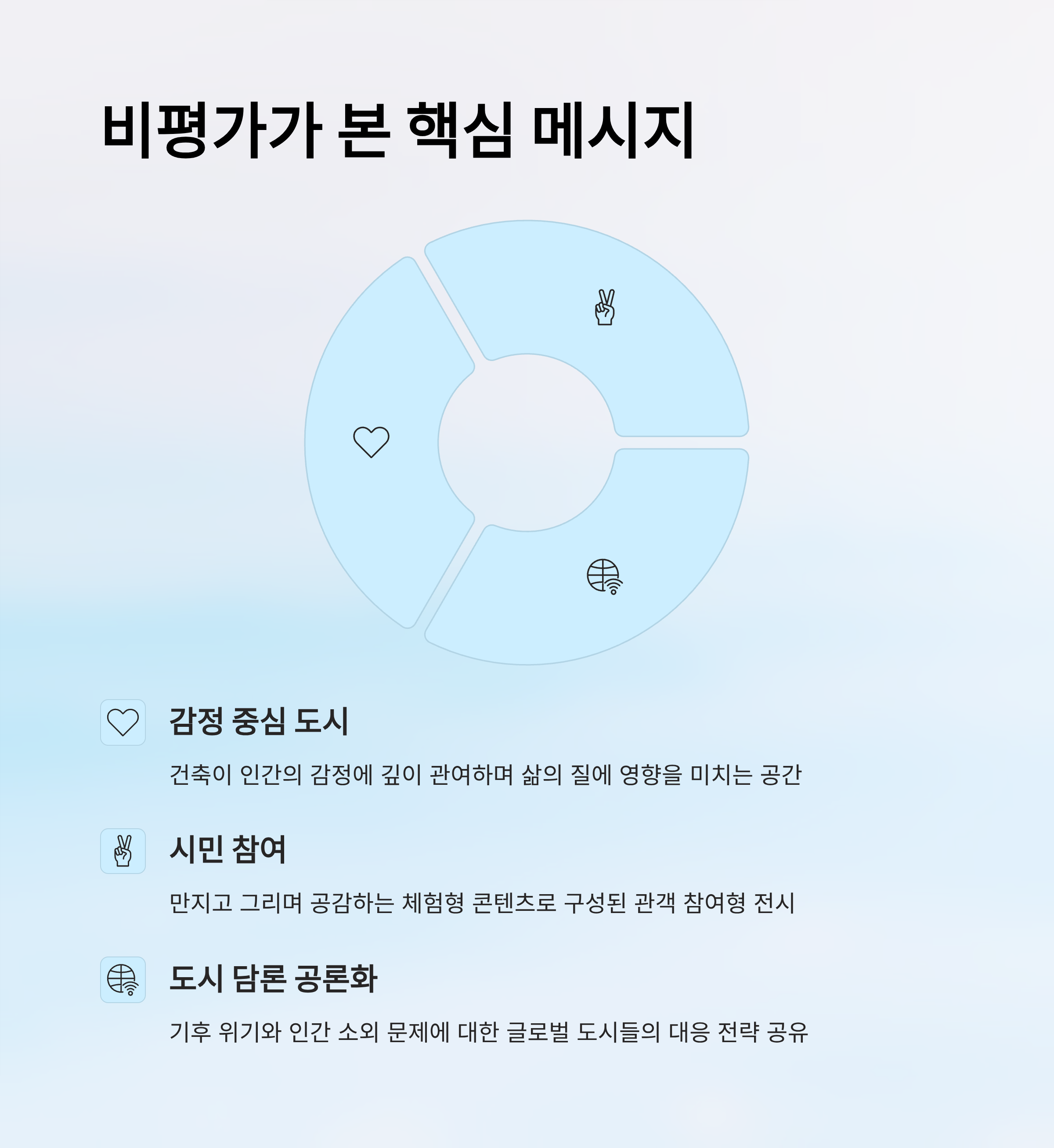 서울도시건축비엔날레는 단순한 전시 행사를 넘어서, 도시의 본질에 대한 철학적 질문을 던지는 플랫폼이에요. 국내외 건축 전문가, 도시 연구자, 비평가들이 이번 전시를 두고 공통적으로 지목한 세 가지 핵심 메시지가 있어요. 이걸 알고 가면 전시가 훨씬 더 깊고 입체적으로 보이게 될 거예요. 🎯