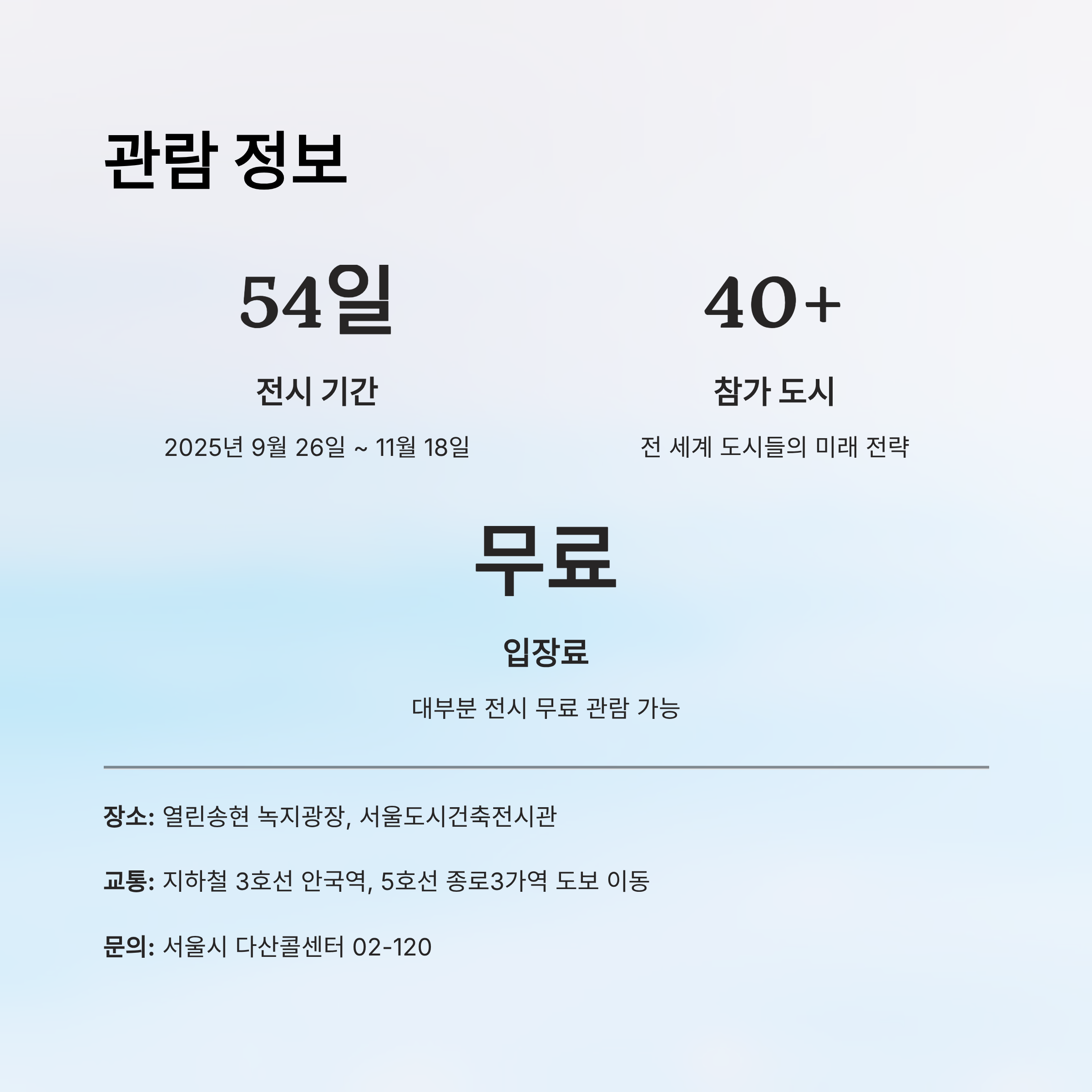 서울도시건축비엔날레는 보는 재미는 물론, 도시를 구성하는 요소에 직접 참여하고 생각을 나눌 수 있는 기회를 제공해요. ‘구경’하는 전시가 아닌 ‘참여’하는 도시 실험실이라고 보면 딱 맞는 말이에요! 😉