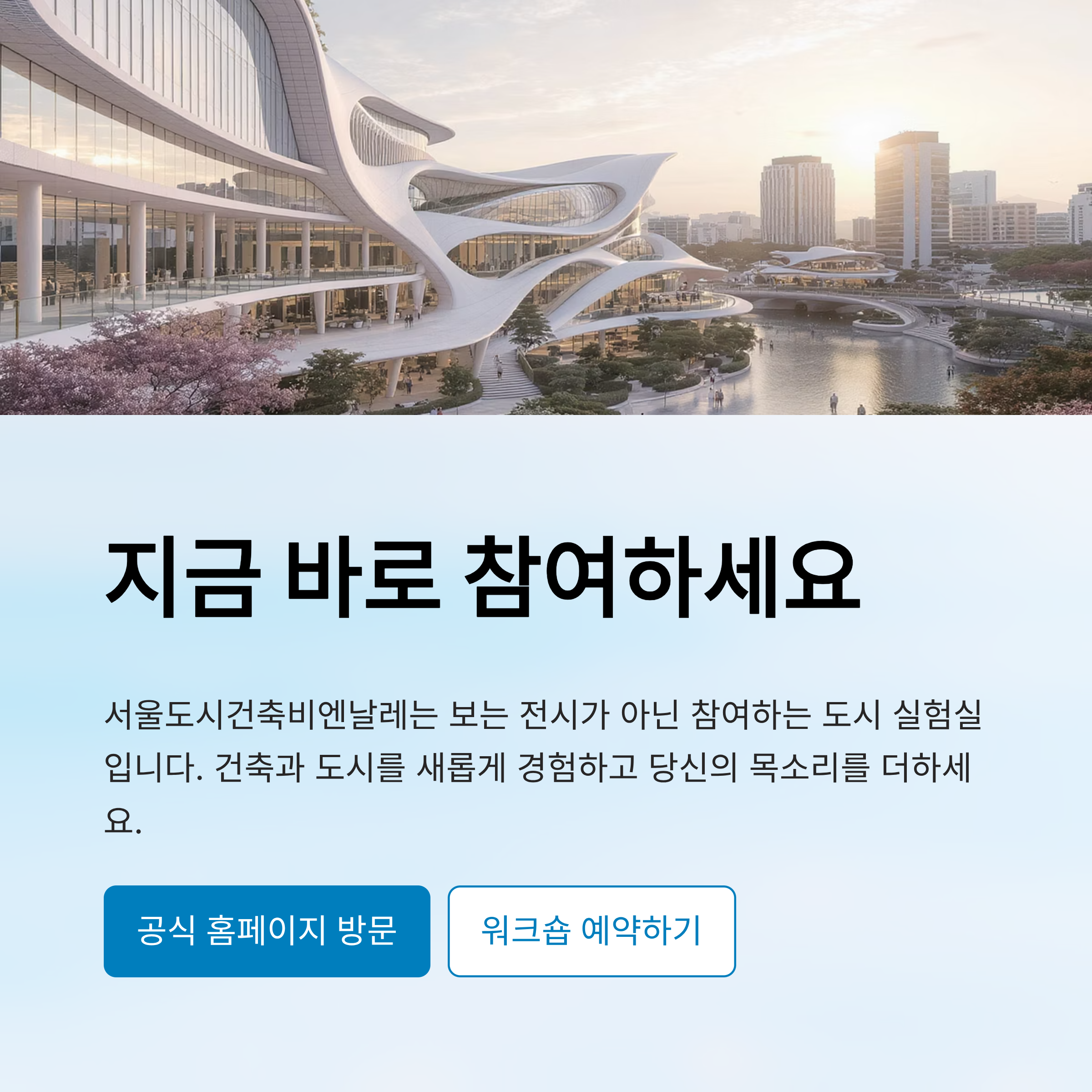 서울도시건축비엔날레에서는 시민이 주인공이에요! 🧍♀️🧍♂️ 다양한 시민 참여형 워크숍이 준비되어 있고, 대부분 온라인 사전 예약이 필수예요. 예약하지 않으면 현장에서 참여가 어려운 경우가 많으니 미리미리 챙기는 게 좋아요.