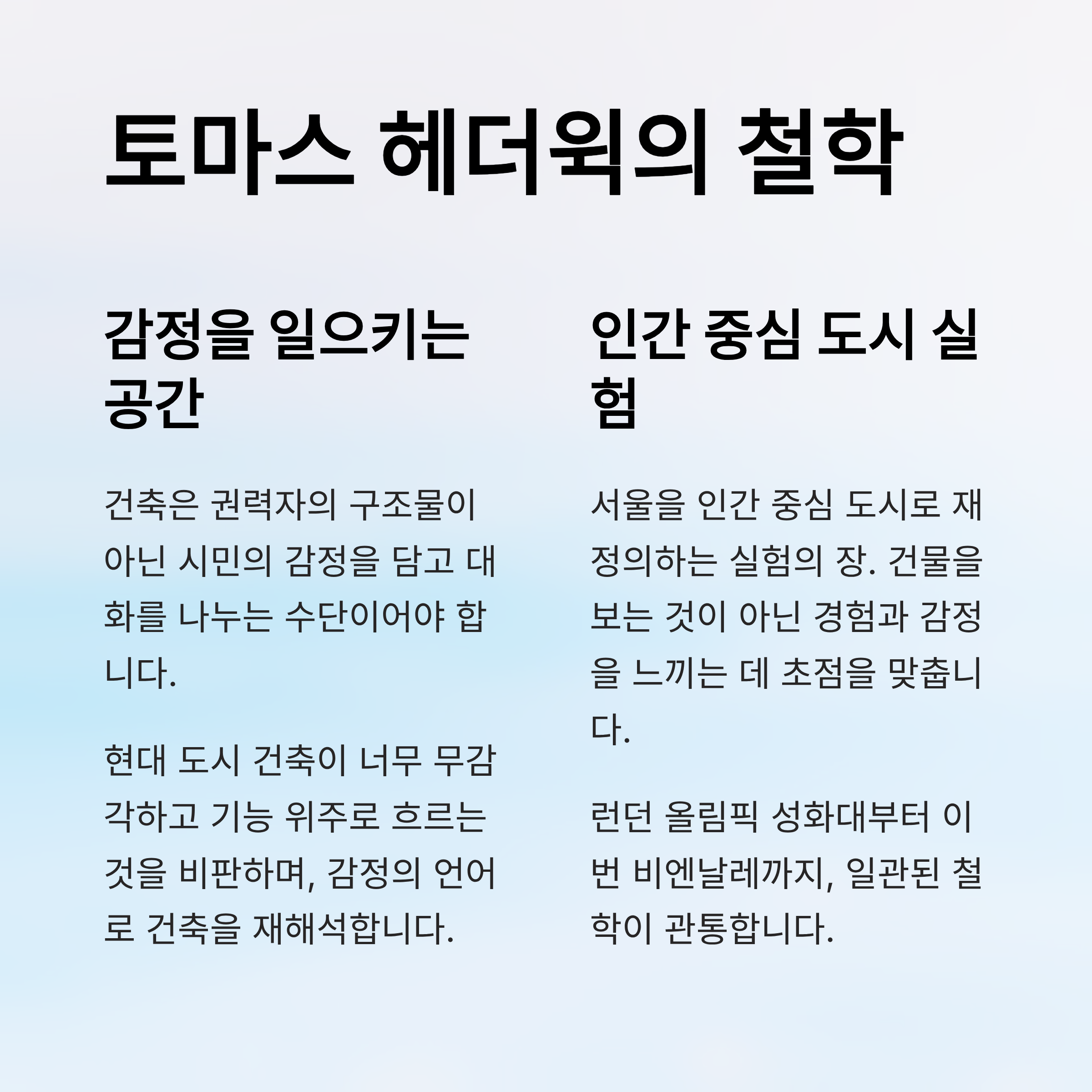 그는 서울을 ‘인간 중심 도시’로 재정의하려는 실험의 장으로 보고 있어요. 단순히 건물을 보는 것이 아니라, 그 안에서 어떤 경험과 감정을 느끼는지를 관찰하는 데 초점을 맞췄죠. 이 방향성은 그가 디자인한 여러 글로벌 프로젝트에서도 일관되게 나타나요.