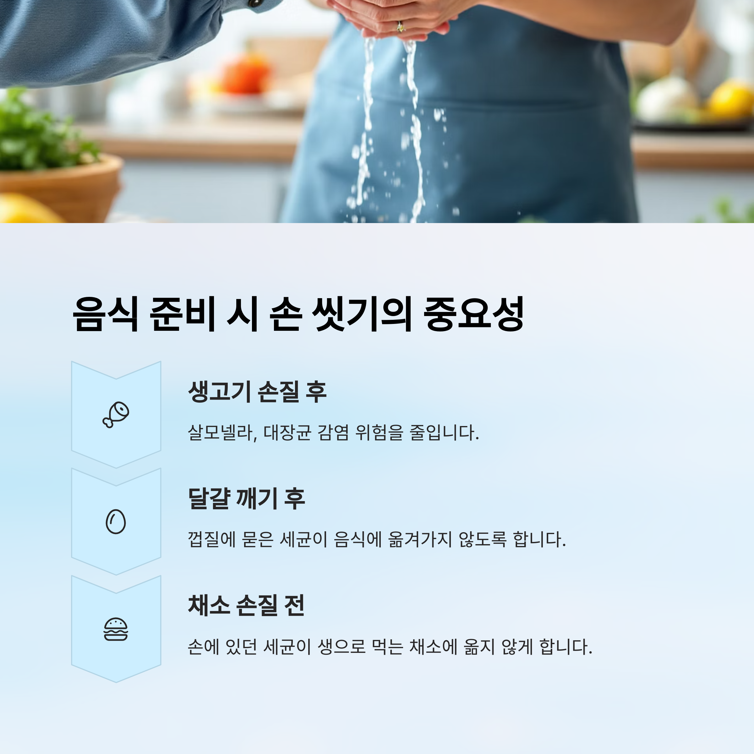 특히 생고기, 달걀, 어패류 등을 다룬 뒤엔 반드시 손을 씻어야 해요. 이런 재료들은 살모넬라나 캠필로박터 같은 세균에 오염되어 있을 수 있거든요. 손 씻기를 건너뛰고 다른 재료를 만지면 교차 오염이 생기게 돼요.