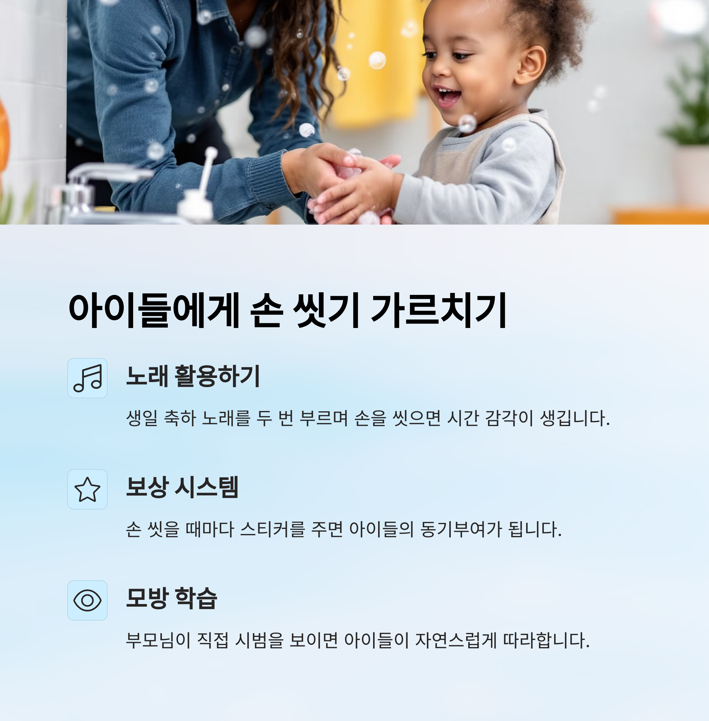 또한 손 씻기의 필요성을 간단히 설명해주는 것도 좋아요. '손을 씻으면 배탈이 안 나요', '친구들한테 병을 안 옮겨요' 같은 쉬운 설명이 아이들에게 더 잘 전달돼요. 어릴 때 몸에 밴 습관은 평생 이어지기 때문에 지금이 중요해요!