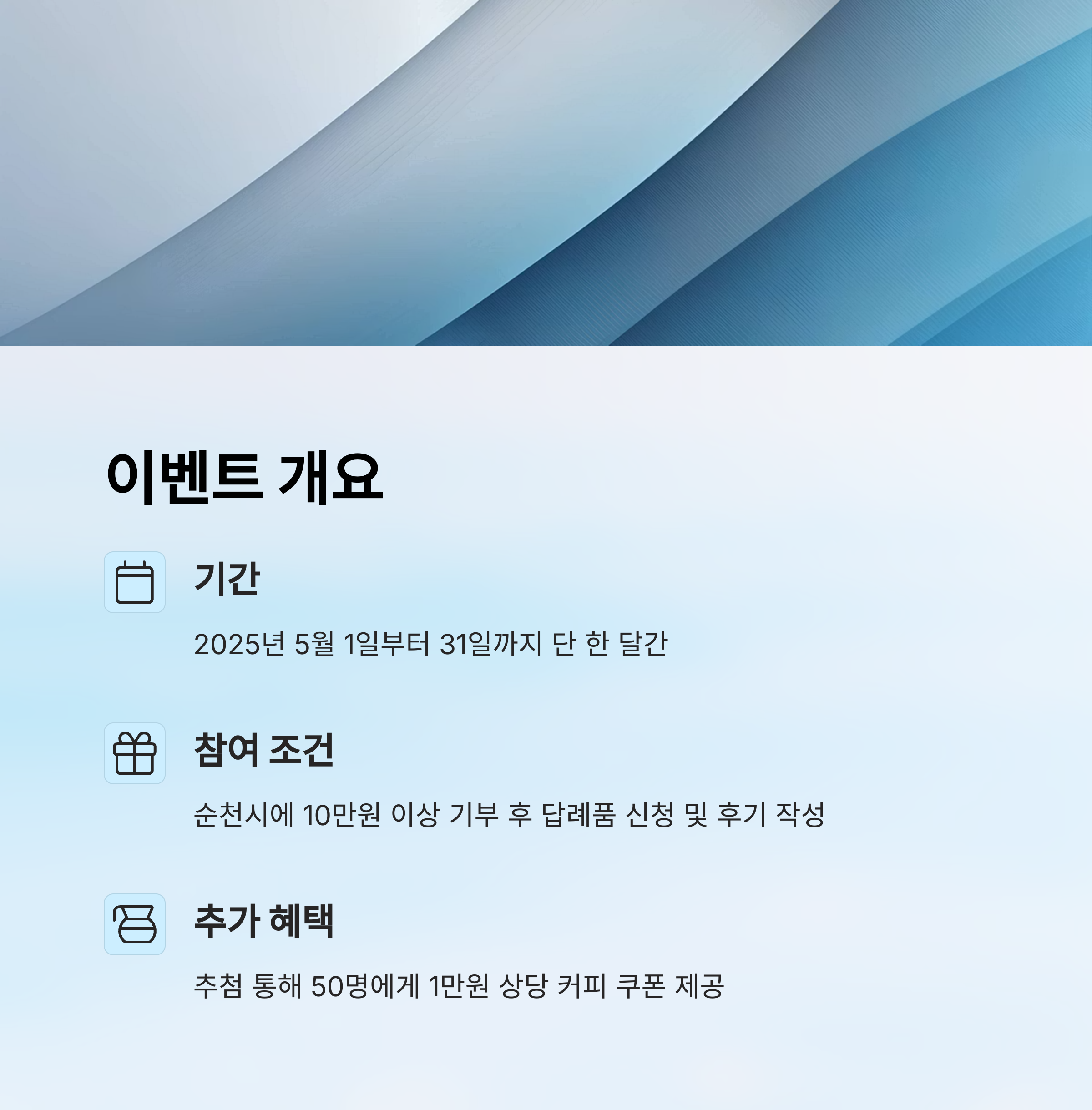 순천시가 5월 가정의 달을 맞아 푸짐한 혜택이 가득한 고향사랑기부제 이벤트를 준비했어요! 💝 고향을 생각하는 마음을 실천하면서 세액공제도 받고, 커피 쿠폰까지 받을 수 있는 절호의 기회랍니다.