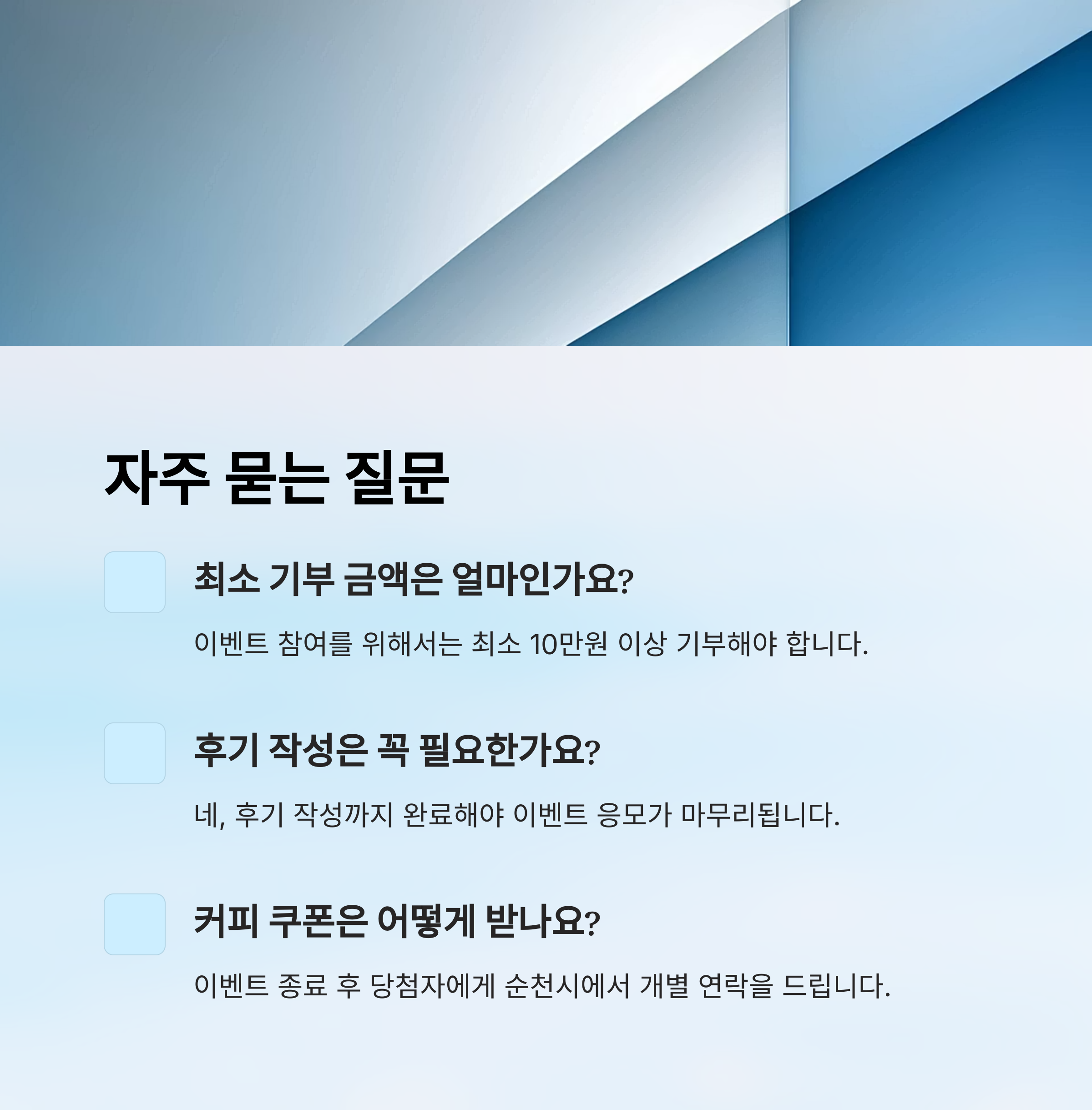 A2. 최소 10만 원 이상 기부해야 이벤트 응모 대상이 돼요.