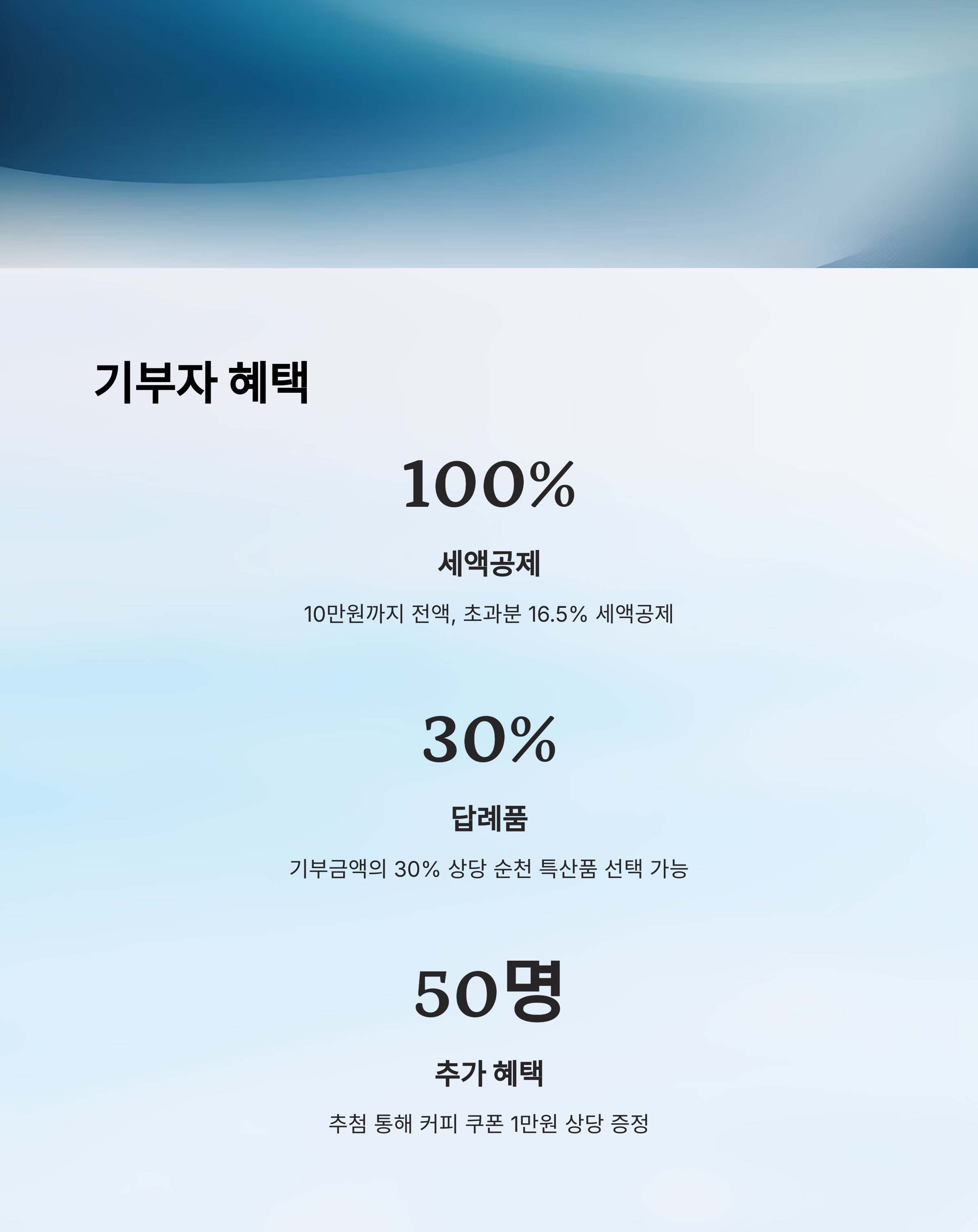 | 답례품 | 기부금의 30% 상당 답례품 선택 가능 |