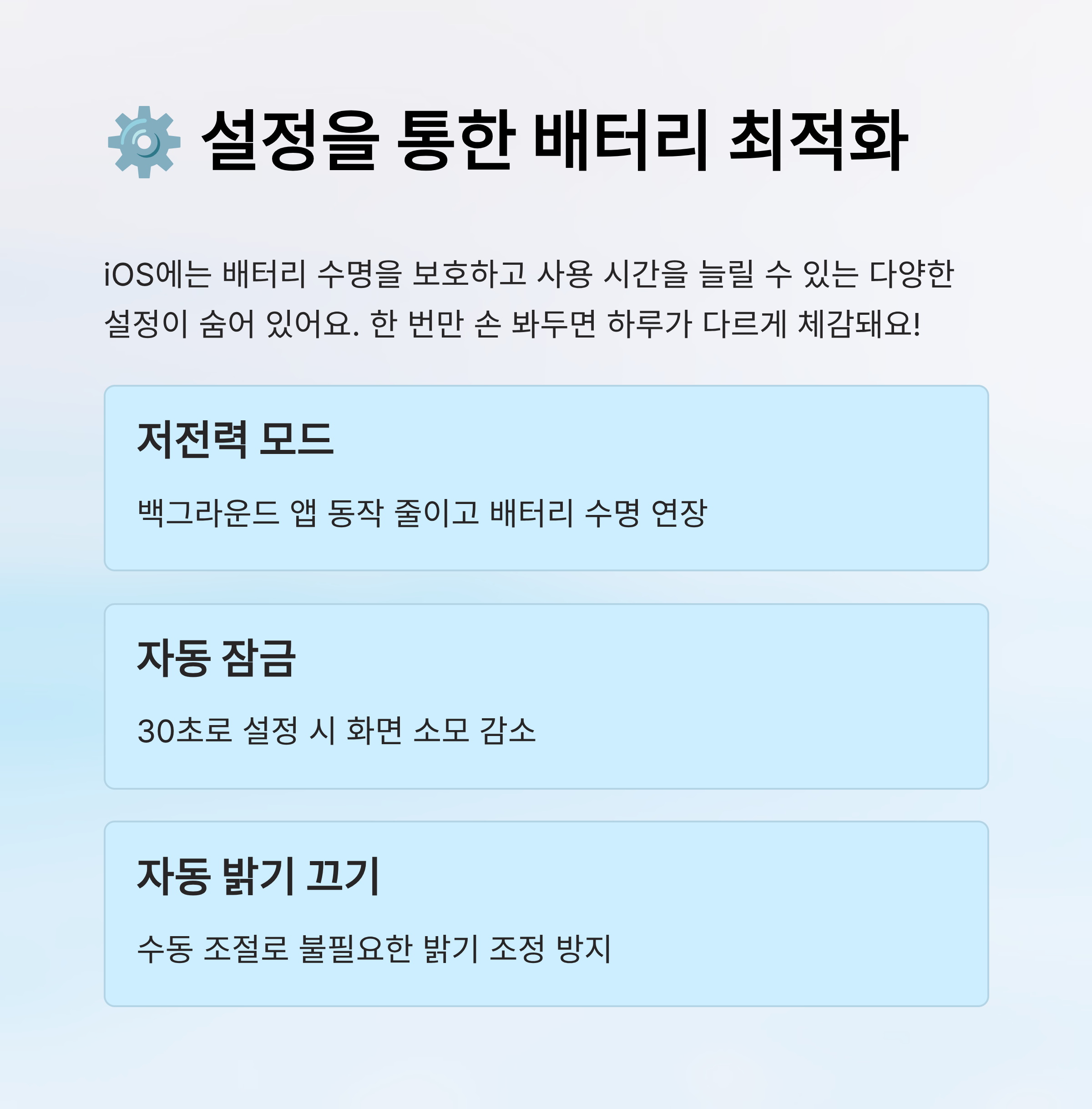 iOS에는 기본적으로 배터리 수명을 보호하고, 사용 시간을 늘릴 수 있는 다양한 설정이 숨어 있어요. 한 번만 손 봐두면 하루가 다르게 체감되니 꼭 체크해보세요! 😊