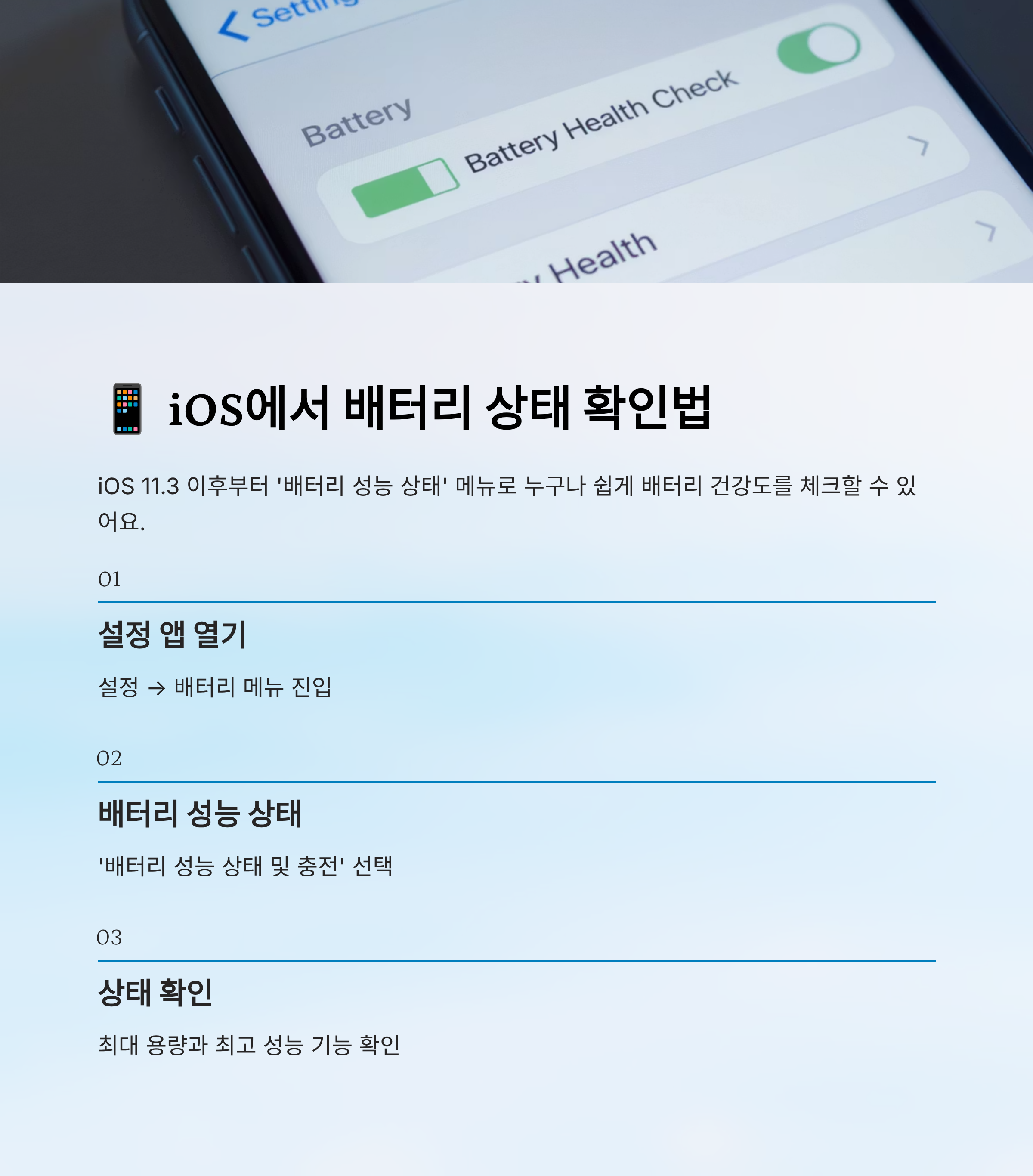 iOS는 배터리 상태를 아주 직관적으로 확인할 수 있게 설계되어 있어요. 특히 iOS 11.3 이후부터는 '배터리 성능 상태' 메뉴가 생기면서 누구나 쉽게 배터리 건강도를 체크할 수 있게 되었죠. 😊