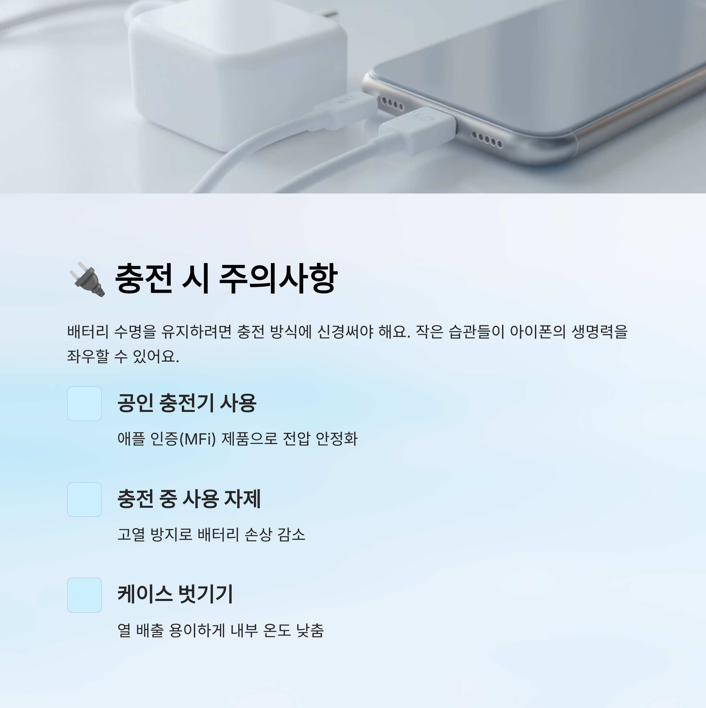 이처럼 충전 습관을 한 번 점검하고 고쳐두면, 장기적으로 아이폰 배터리의 안정성과 지속력이 눈에 띄게 향상된답니다. 🔋