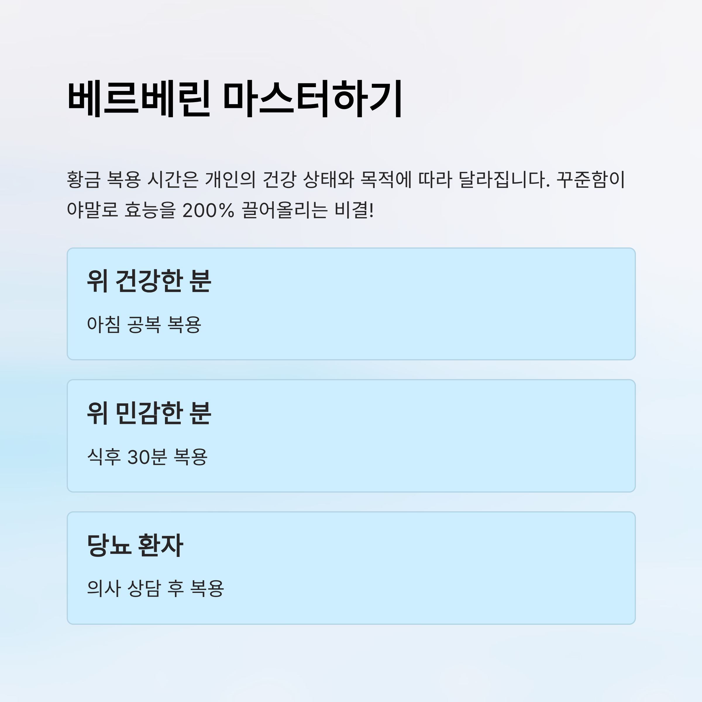 결론적으로, 위장 건강이 좋고 부작용이 없는 사람은 아침 공복 복용을 시도해볼 수 있고, 위가 약하거나 혈당 변동을 줄이고 싶은 사람은 식후 30분 복용을 권장할 수 있어요. 이렇게 상황에 맞게 섭취 방법을 달리하면 베르베린 효능을 200% 끌어올릴 수 있답니다. ⚖️