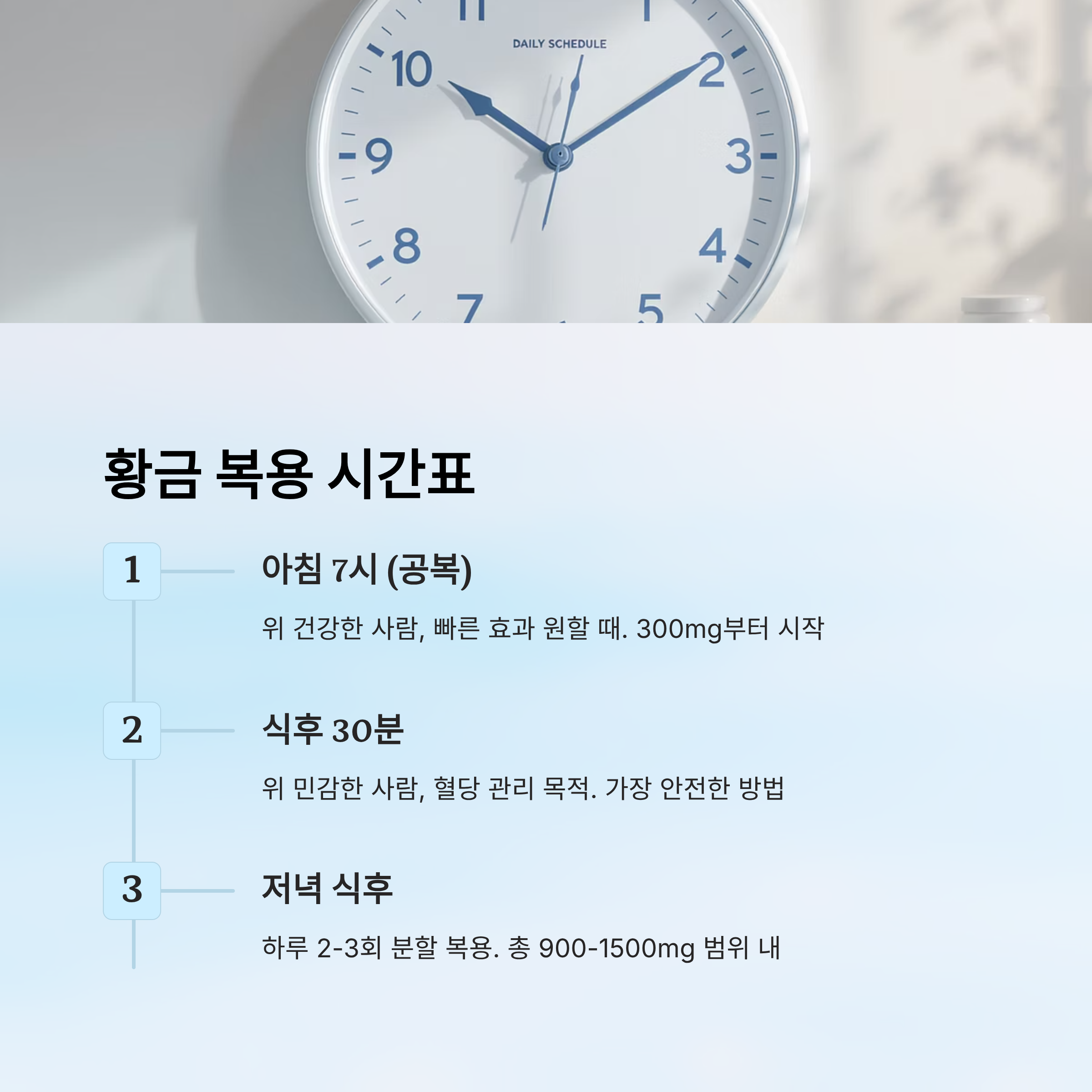 복용량은 권장 범위인 하루 900~1500mg을 넘기지 않는 것이 중요해요. 처음 시작할 때는 300mg 정도의 낮은 용량을 하루 2~3회 나눠 먹으면서 몸의 반응을 확인하는 것이 가장 안전해요. 부작용이 없다고 느껴질 때 점차 용량을 늘려 나가는 방식이 좋아요.