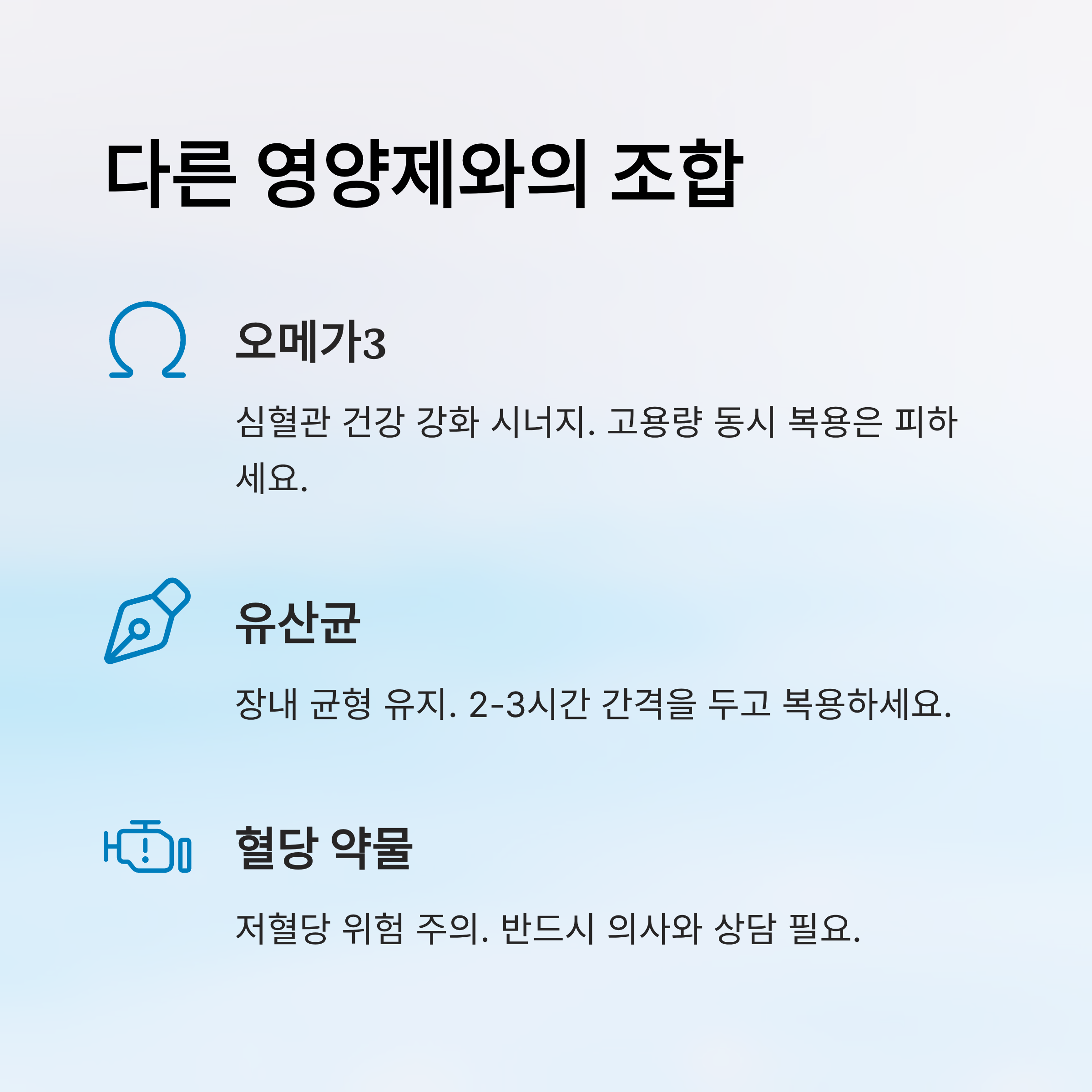 반면, 혈당을 낮추는 약물이나 영양제(예: 알파리포산, 크롬, 인슐린 제제)와는 조심해서 병용해야 해요. 혈당이 지나치게 떨어질 위험이 있기 때문이에요. 따라서 당뇨약을 복용 중인 사람은 반드시 의사와 상담한 뒤 조합하는 것이 안전해요.