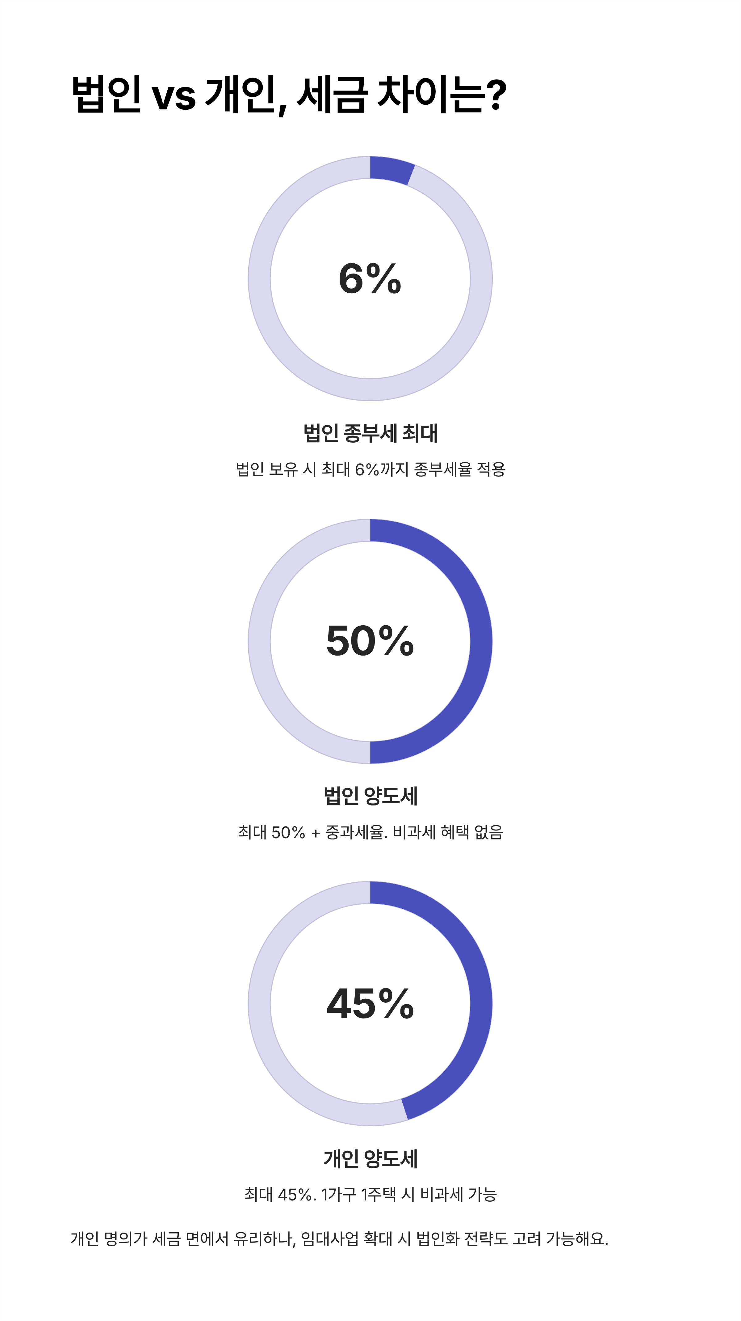 따라서 부동산을 매입할 때, 단순한 투자 목적이라면 법인보다는 개인 명의가 유리할 수 있고, 임대 사업 확대를 염두에 두고 있다면 법인화 전략을 쓰는 경우도 있어요.
