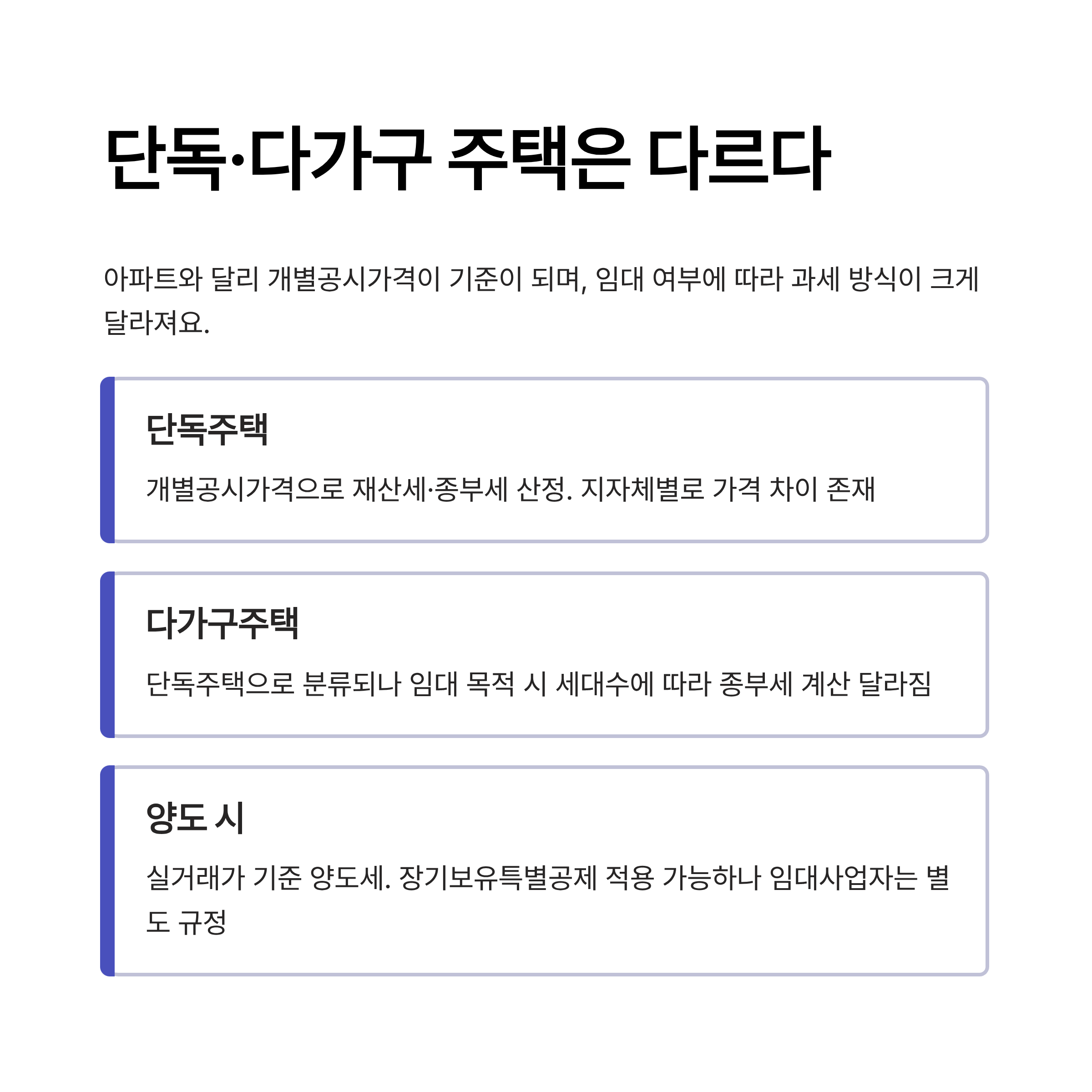 | 다가구주택 | 개별공시가격 + 세대수 기준 | 종부세, 임대소득세 | 임대 등록 여부에 따라 달라짐 |