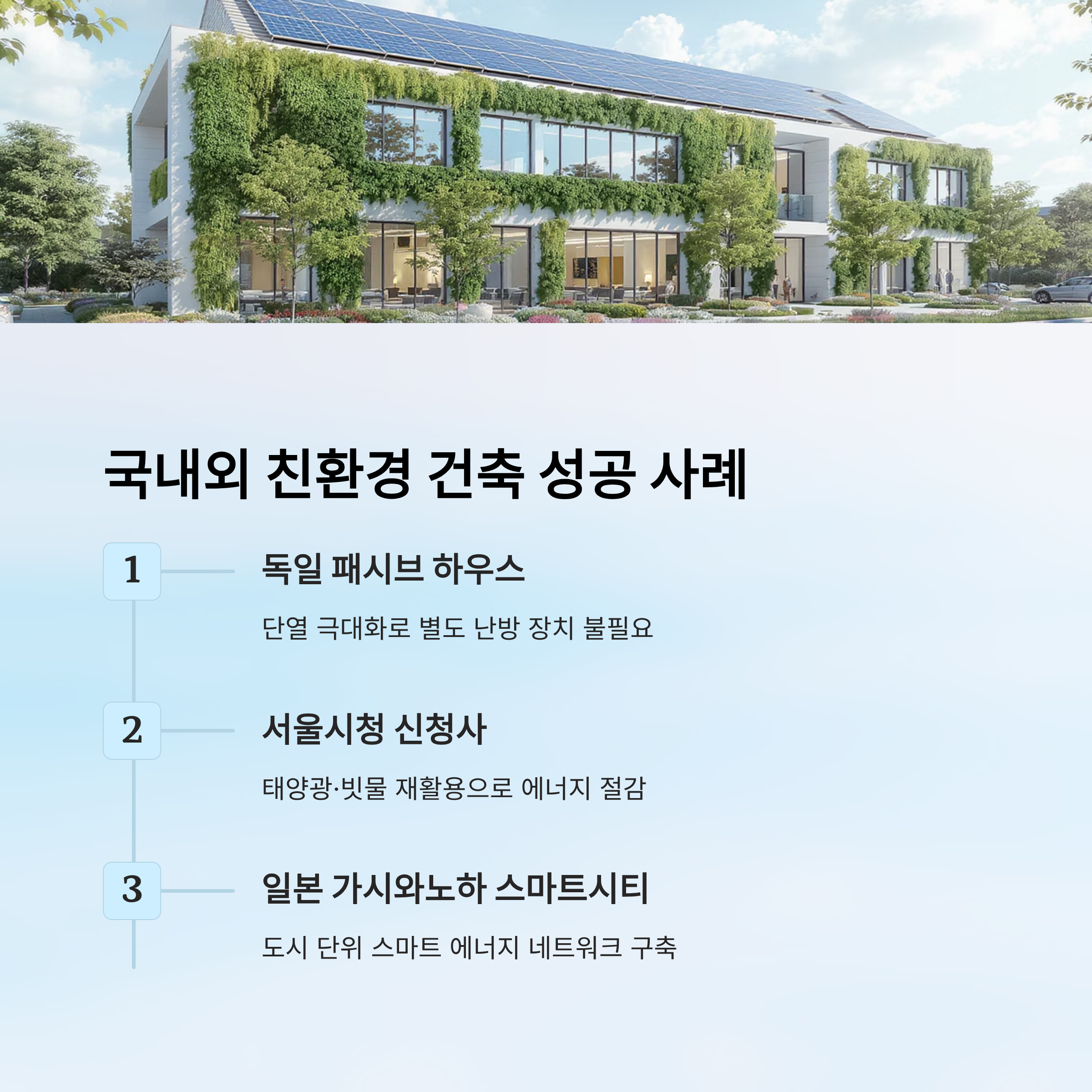 | 대표 사례 | 단열재, 채광, 환기 설계 | 태양광 패널, 지열 냉난방 |