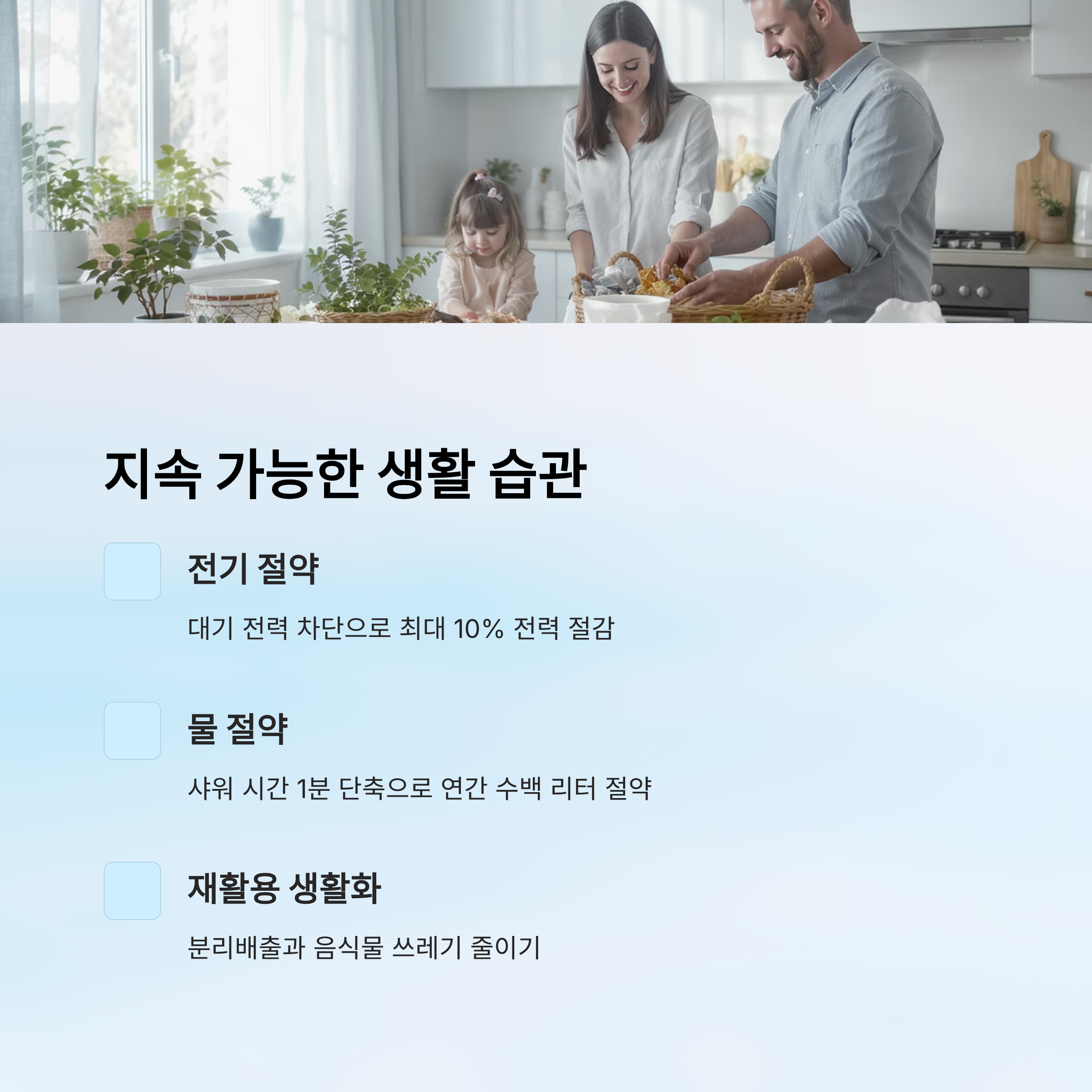 | 물 절약 | 샤워 시간 줄이기, 절수기 사용 | 수자원 보호 |
