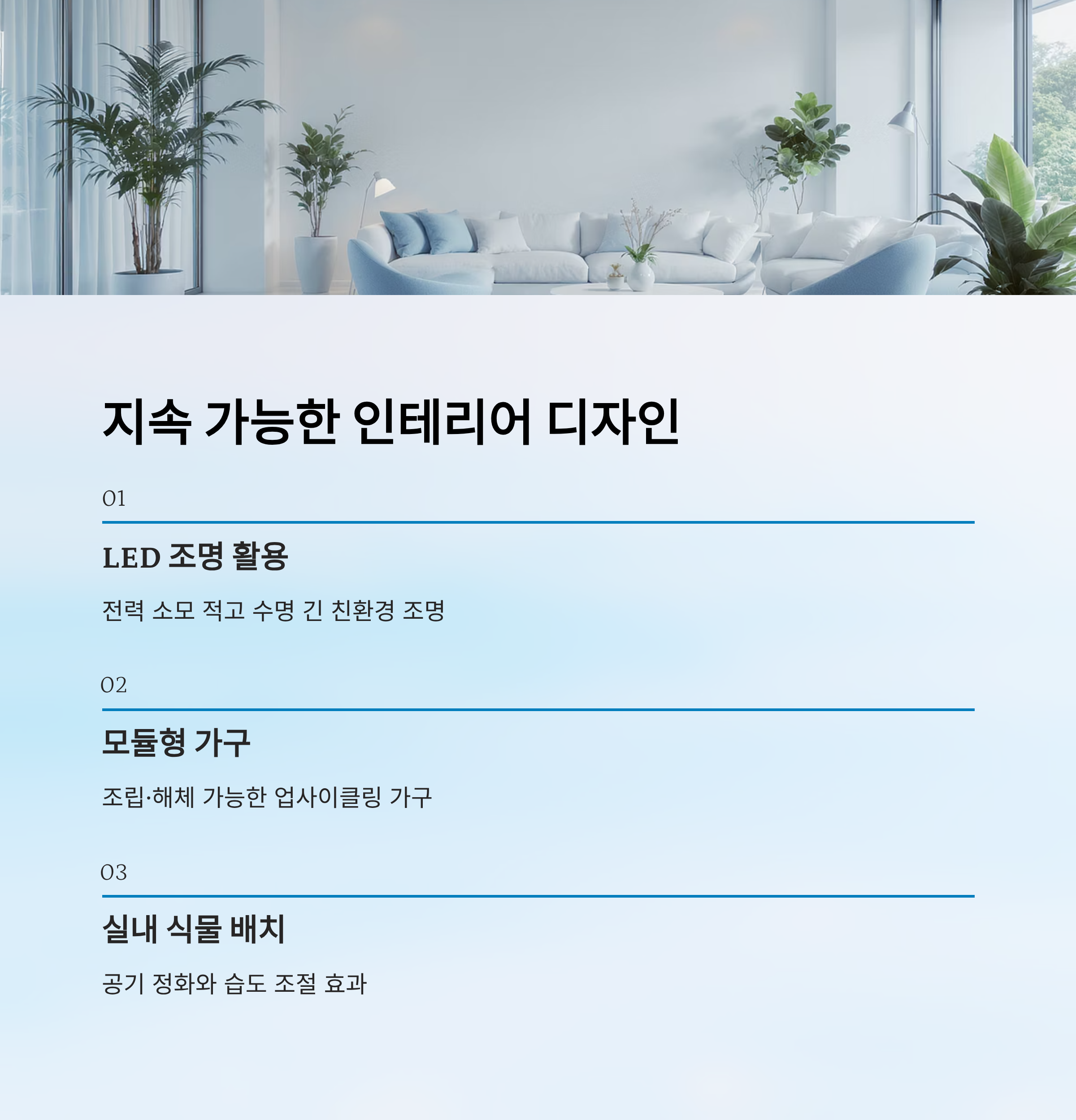 | 실내 식물 | 공기 정화, 습도 조절 | 심리적 안정, 건강 | 모든 공간 |