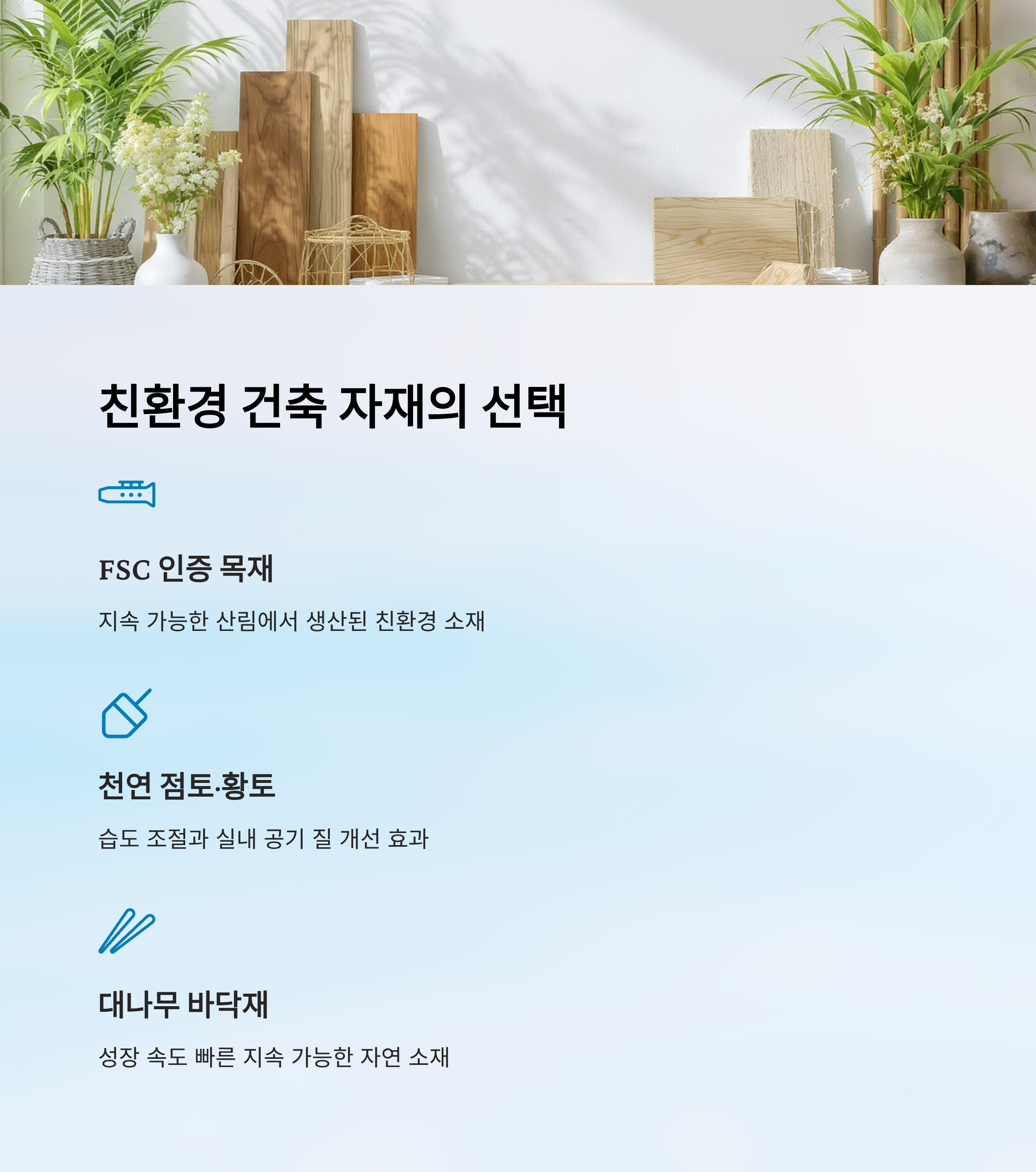 | 목재(FSC 인증) | 지속 가능한 산림에서 생산 | 탄소 저장, 따뜻한 분위기 | 바닥, 벽, 가구 |