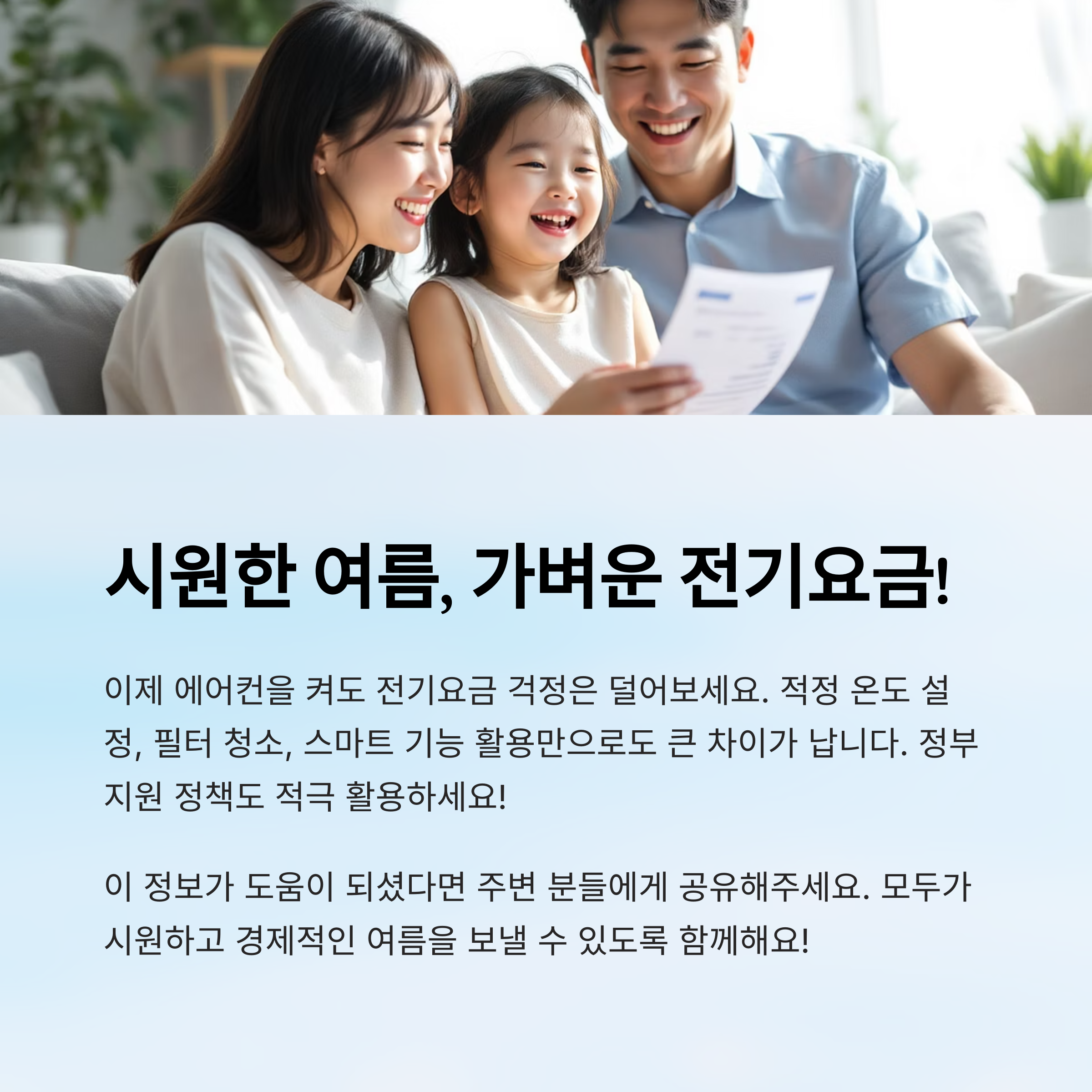 여름 전기요금이 걱정된다면, 정부와 지자체의 도움을 적극 활용해보세요. 정보만 잘 챙겨도 냉방비 걱정을 절반 이하로 줄일 수 있어요!