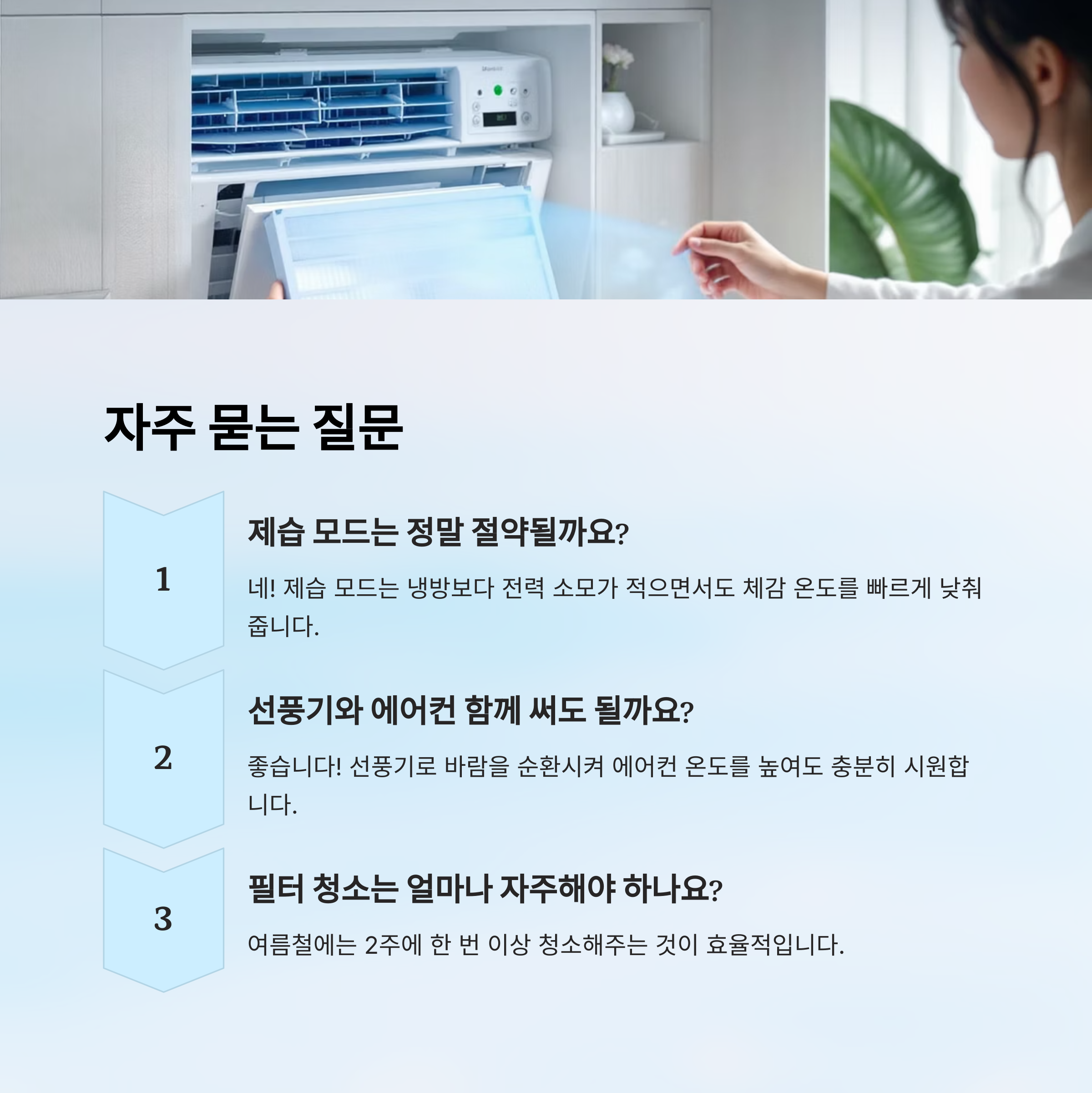 A3. 네! 제습 모드는 냉방보다 전력 소모가 적으면서도 체감 온도를 빠르게 낮춰줘요. 전기요금도 줄고 실내도 쾌적해요.