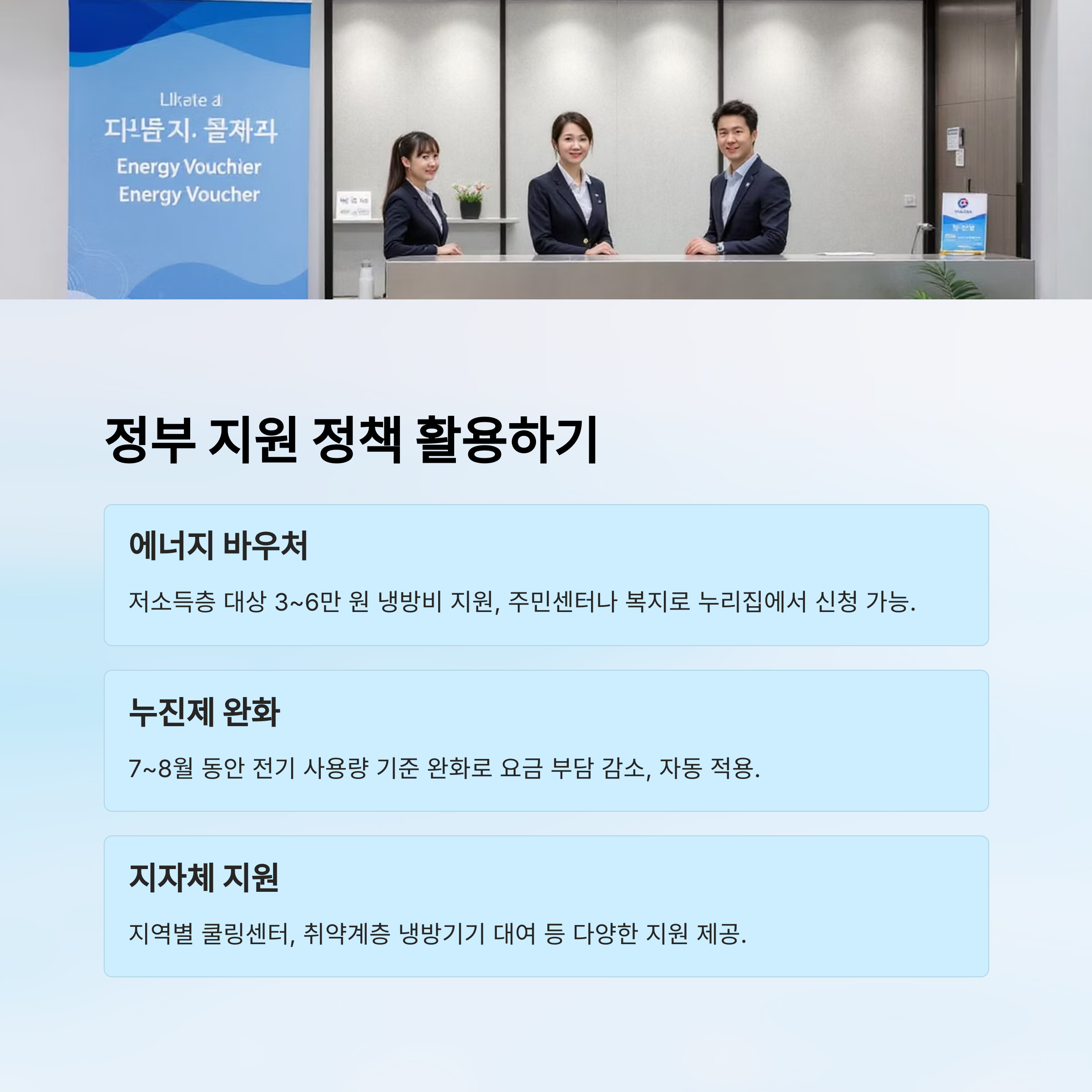 정부는 여름철 전기요금 부담을 줄이기 위해 다양한 냉방비 지원 정책을 마련하고 있어요. 특히 에너지 취약계층과 저소득 가정을 위한 ‘에너지 바우처’ 제도가 대표적이에요. 이 제도는 여름철 냉방비로 사용할 수 있는 금액을 정기적으로 지원해주는 정책이에요.