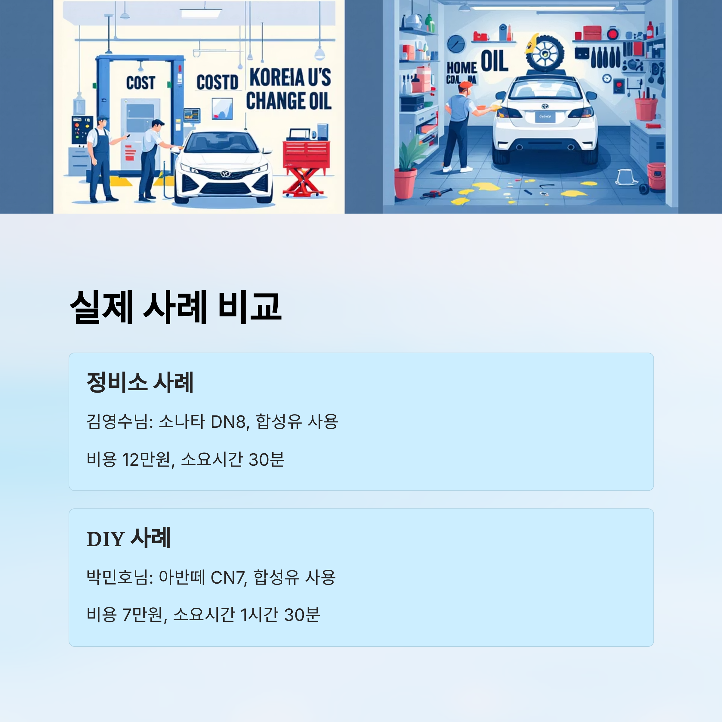 👉 김영수 씨는 정비소에서 엔진오일을 교환했어요. 비용이 다소 높지만 빠르게 끝났고, 추가 점검도 받을 수 있었어요! 😊