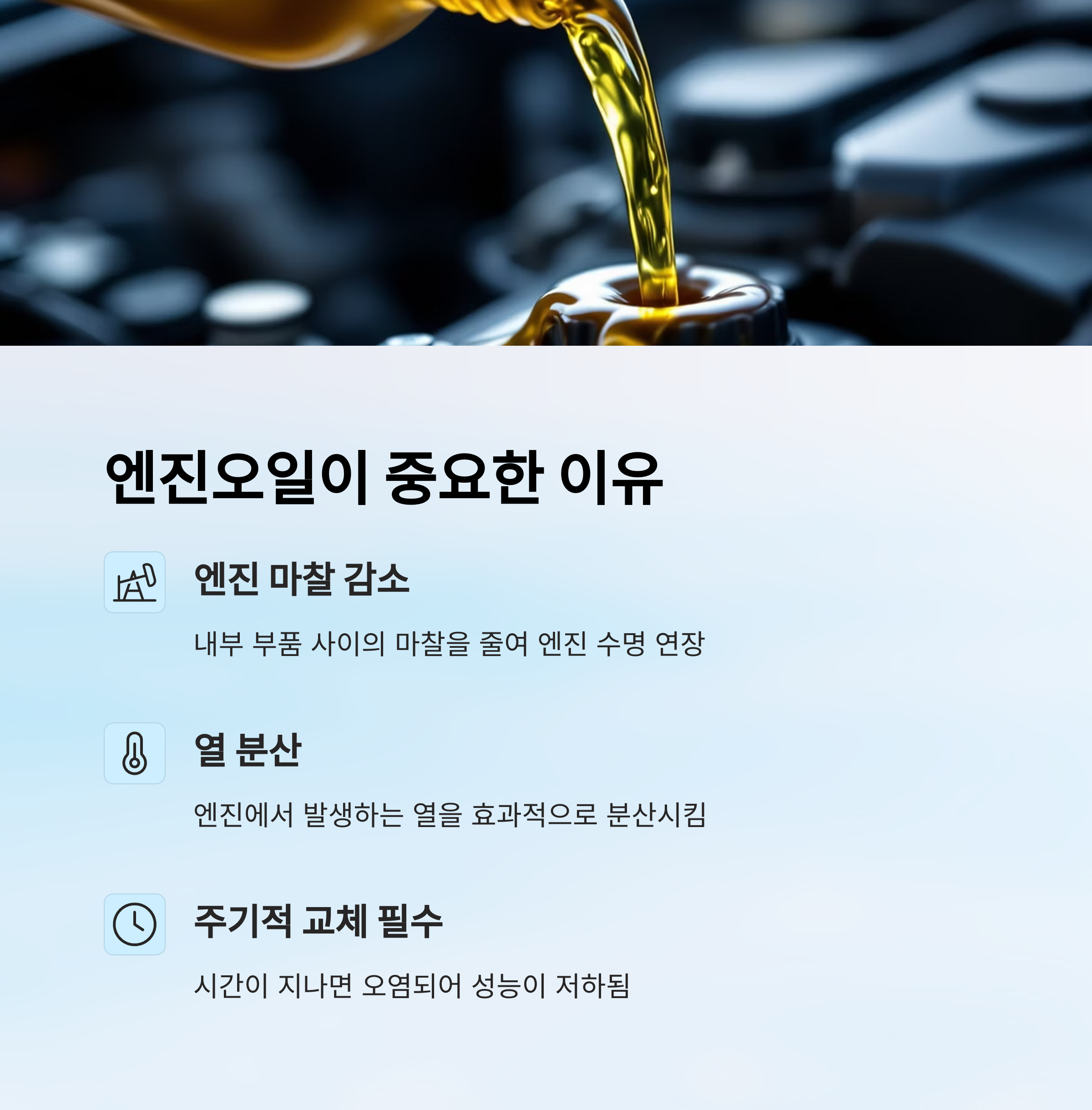 엔진오일은 엔진 내부의 마찰을 줄이고 열을 분산시켜 엔진이 원활하게 작동하도록 도와주는 중요한 윤활유예요. 시간이 지나면 오염되거나 점도가 낮아져 주기적으로 교체해 줘야 해요.