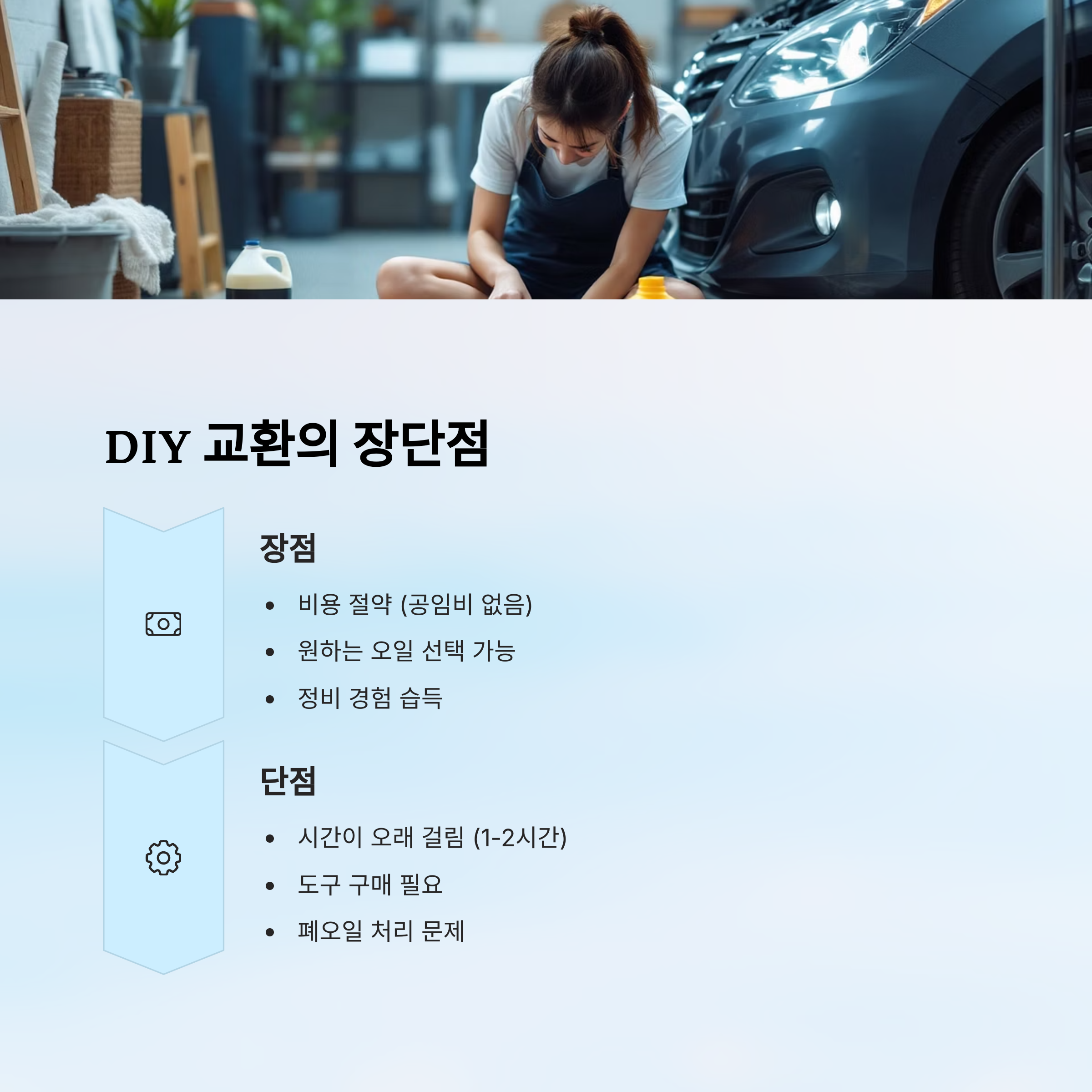 정비소에서 엔진오일을 교환하면 빠르고 편리하지만 비용이 더 들어요. 그럼 장단점을 살펴볼까요? 🤔
