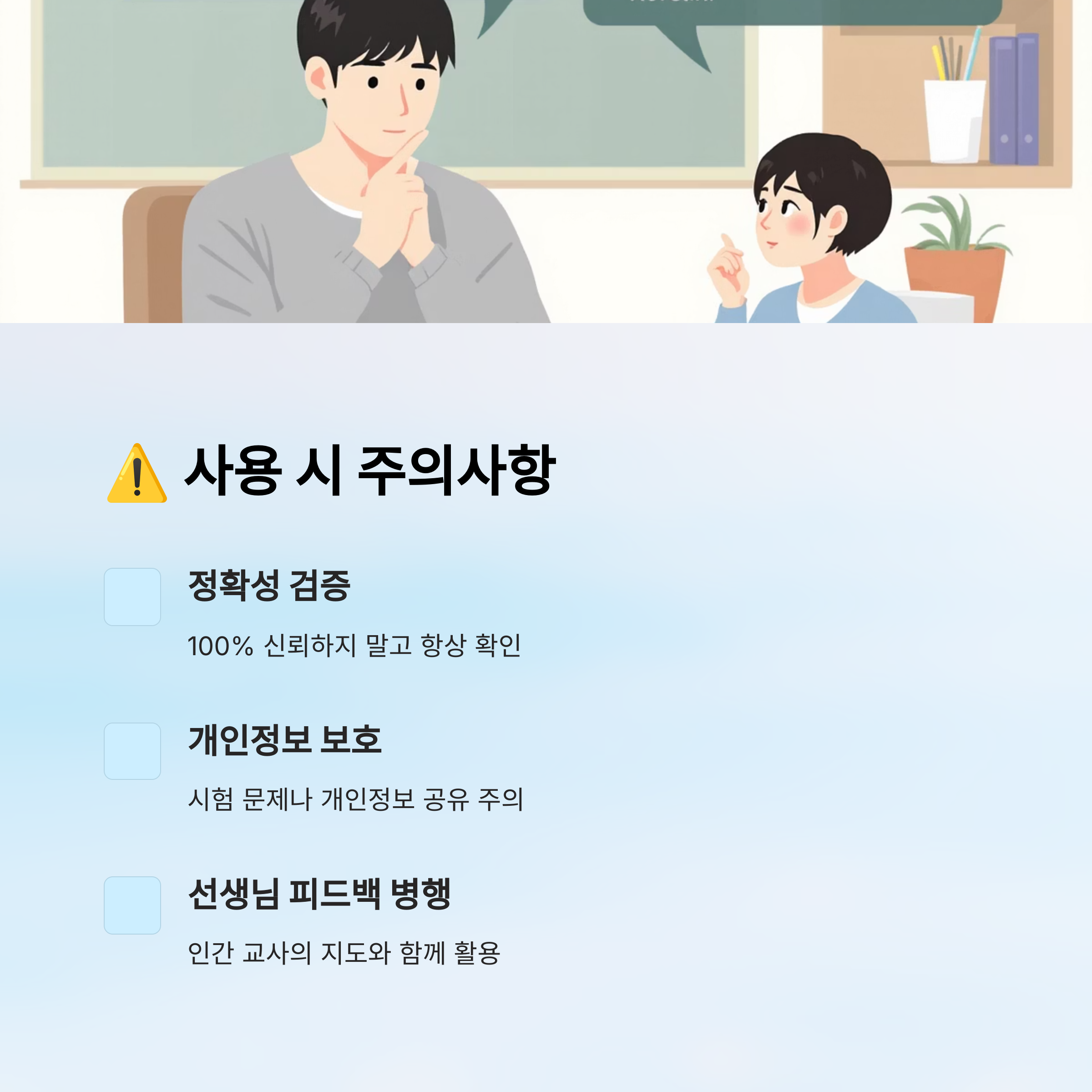 그리고, 개인정보나 학습 결과를 제미니에 무분별하게 입력하는 것도 주의해야 해요. 제미니는 기본적으로 대화형 AI이지만, 민감한 정보를 보호해줄 책임이 있는 건 아니거든요. 따라서 개인 정보나 학교 관련 민감한 정보는 입력하지 않는 것이 좋아요.