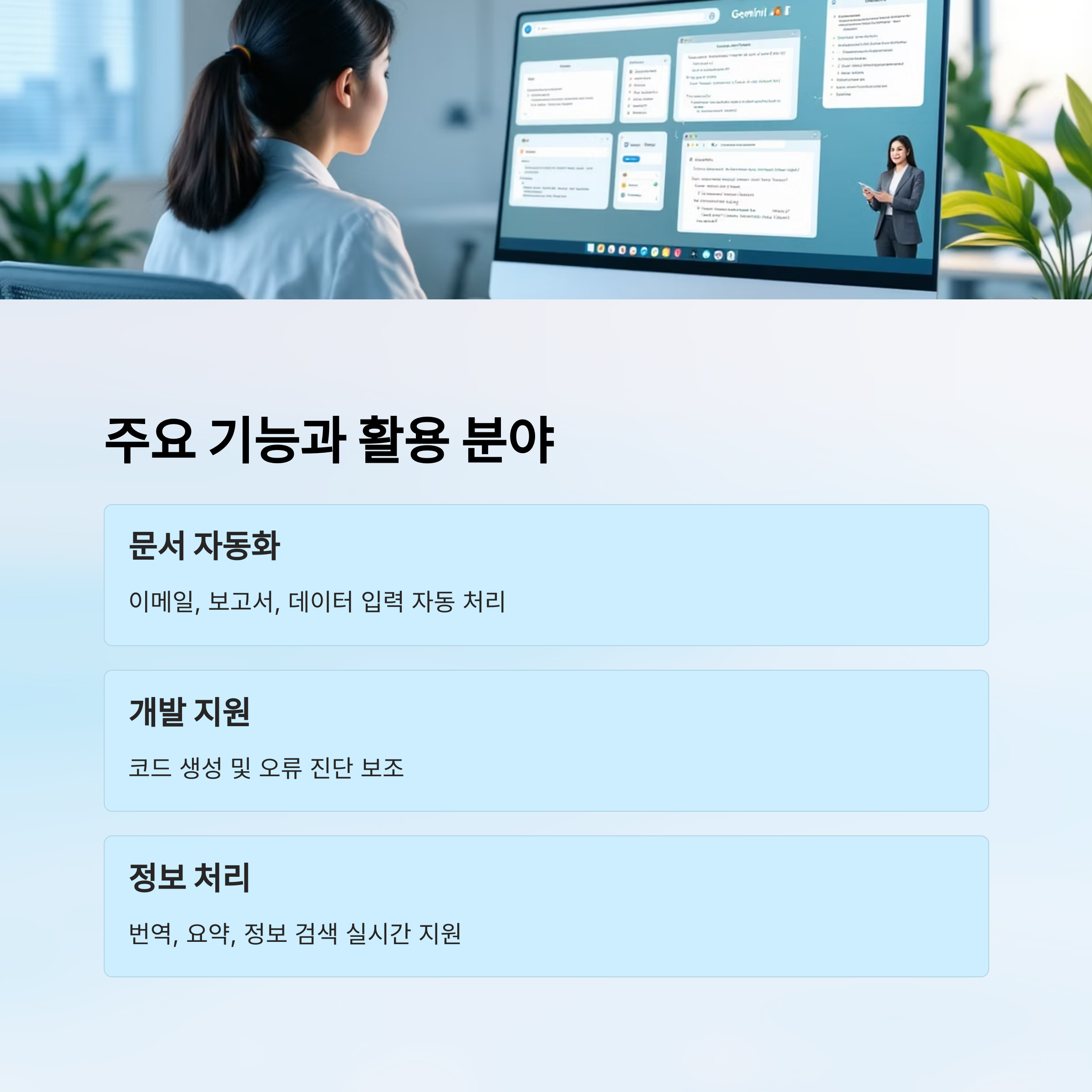 제미니 AI는 단순히 대화를 이어가는 수준을 넘어서, 복잡한 작업을 자동화하는 데 특화된 기능들을 탑재하고 있어요. 대표적으로 문서 요약, 이메일 자동 작성, 회의록 정리, 프로젝트 일정 추천 등이 있어요.