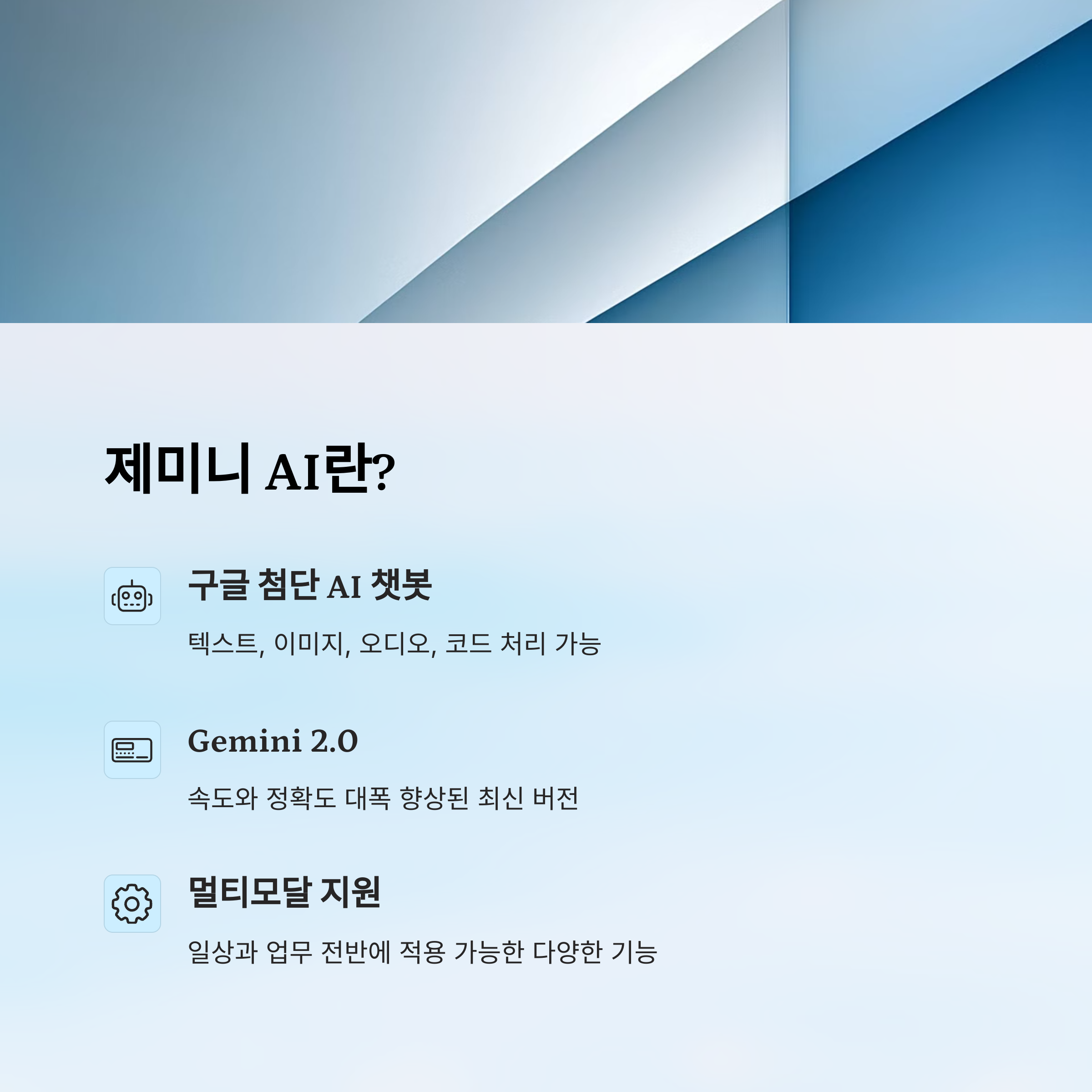 제미니 AI는 구글이 개발한 차세대 인공지능 모델이에요. 기존의 BERT와 LaMDA를 결합한 형태로, 텍스트와 이미지, 오디오, 영상 등 멀티모달 데이터를 동시에 처리할 수 있는 능력을 갖추고 있어요.
